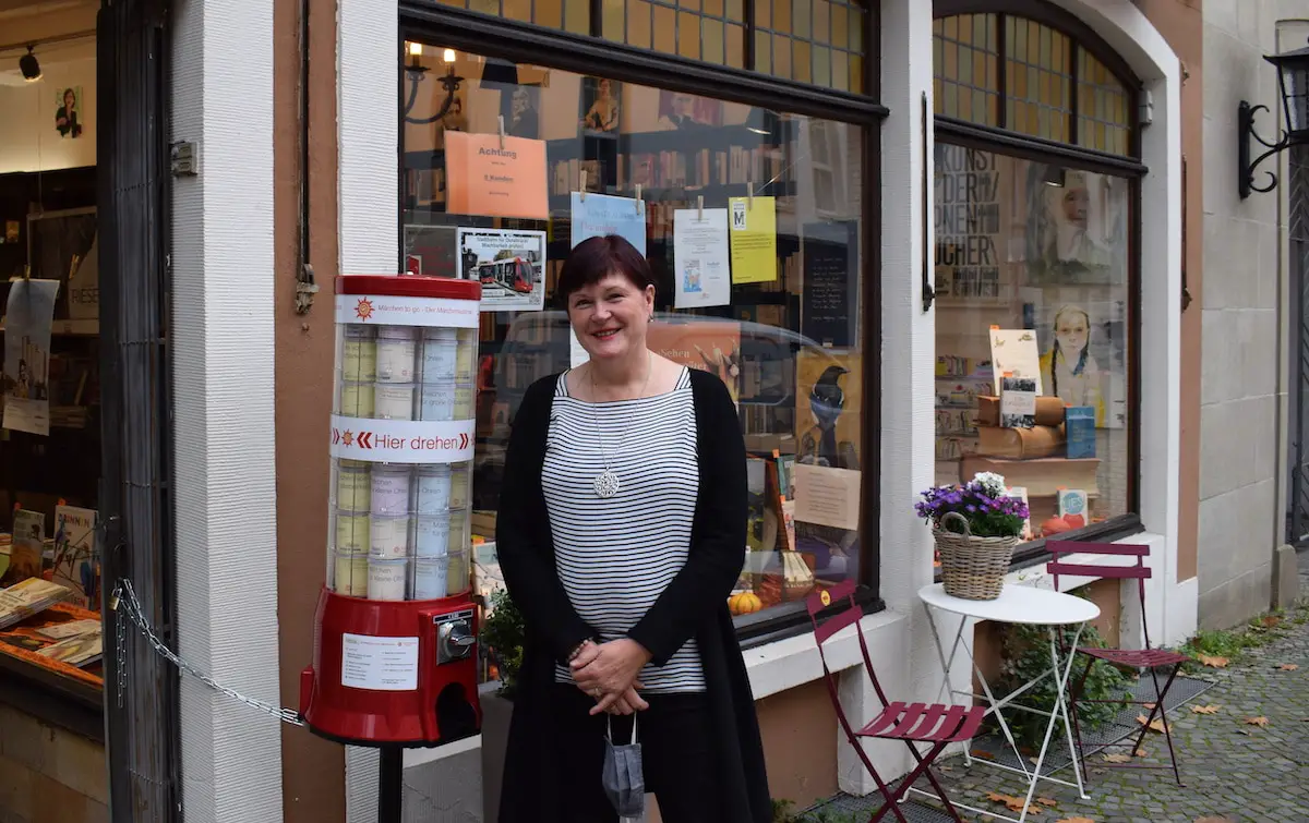 Karin Steinke-Klingenburg zeigt den Automaten vor ihrer Buchhandlung.