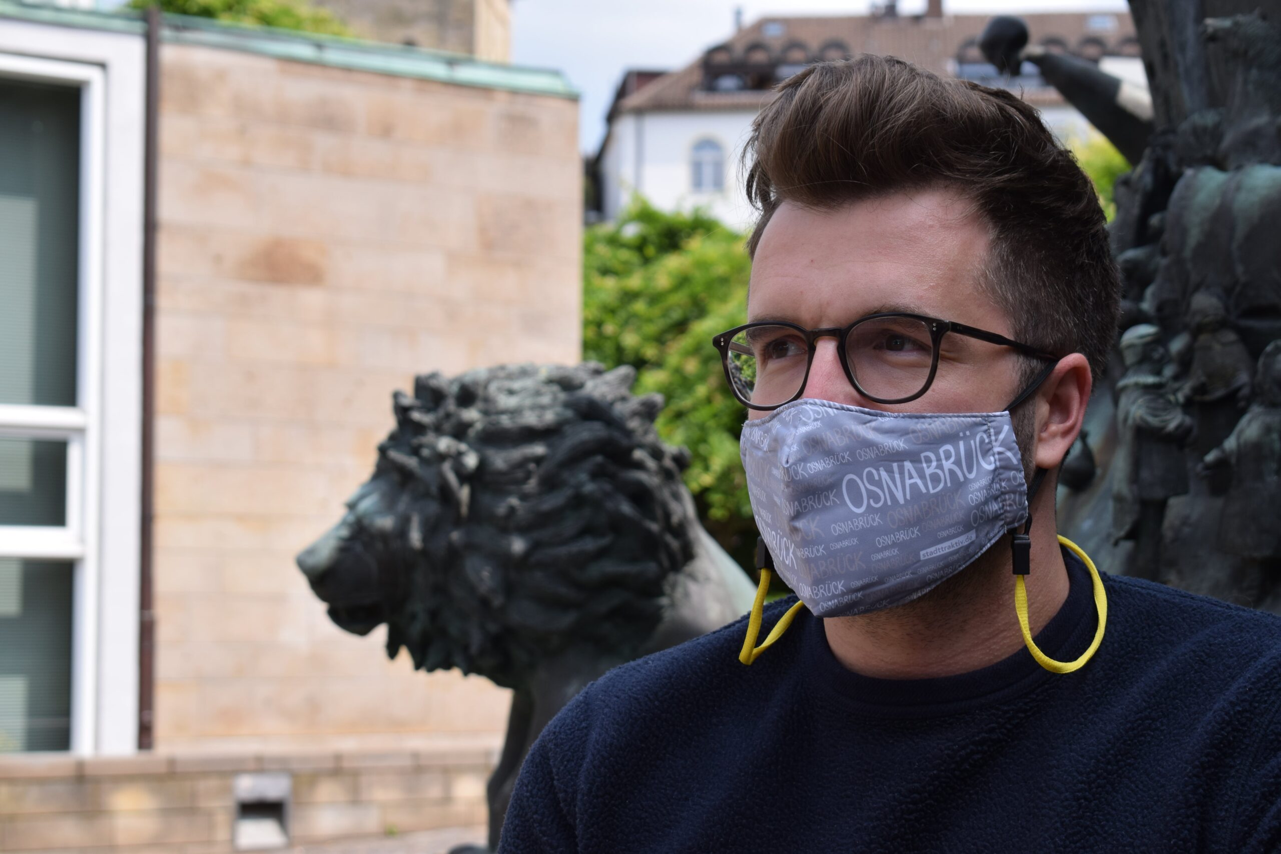 Aktuell gibt es die Osnabrück-Gesichtsmaske nur im grau-weißen Design. „Das andere Modell hängt noch in China fest, wo ich die Masken produzieren lasse“, lacht Frontzek. Neben dem Mund-Nasenschutz mit Heimatgefühl bringt er auch sogenannte Maskenbänder auf den Markt. „Die Leitfrage war: Wohin mit der Maske, wenn man sie gerade nicht braucht? Viele stecken sie dann in ihre Hosentasche oder klappen sie unter den Mund und verbiegen damit ihre Ohren. Da muss es eine bessere Alternative geben, dachte ich mir“, erzählt Frontzek. Die Gesichtsmaske kann mit dem Maskenband einfach um den Nacken getragen werden, ähnlich wie mit einem Brillenband.