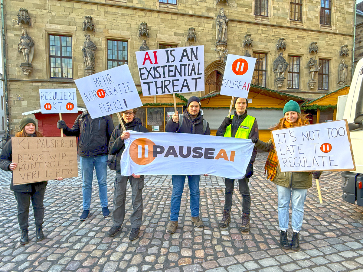 Vor dem Rathaus und vor der Osnabrücker Universität demonstrierten die Teilnehmer für eine stärkere Regulierung der Entwicklung Künstlicher Intelligenz (KI). Die Demonstration war Teil eines weltweiten Protesttages, der auf die Risiken unregulierter KI-Entwicklung aufmerksam machen soll. In Osnabrück waren es Schüler und Studierende, die sich engagierten. Dabei waren Studenten der Mathematik und Informatik, die durch ihr Studium Einblick haben in die aktuelle Entwicklung, in der Überzahl.