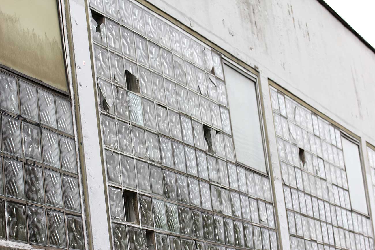 Schon von außen keine Pracht mehr. Teile der Glasbausteine sind zerbrochen. Isolierung? Fehlanzeige.