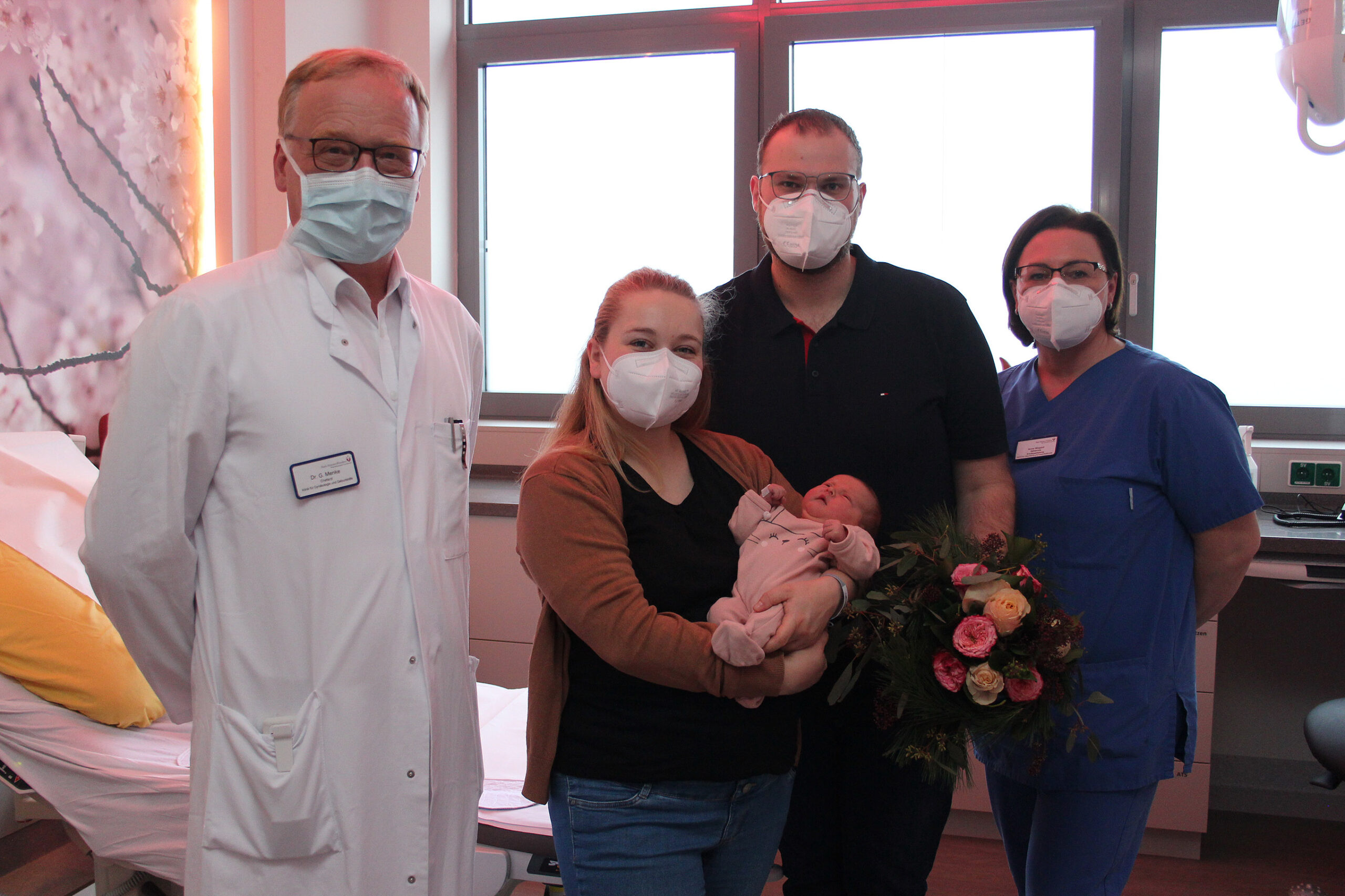 Freude über die erste Geburt im neuen MHO-Kreißsaal bei den Eltern Carolin und Tobias Langer mit Baby Sophie (Mitte), Chefarzt Dr. Götz Menke (links) und Leitender Hebamme Iwona Wiegand. /Foto: Daniel Meier/MHO