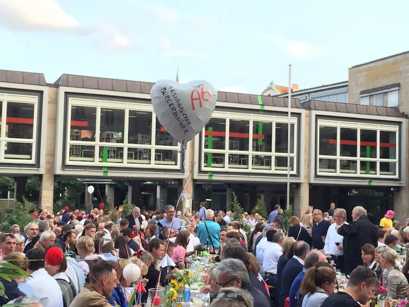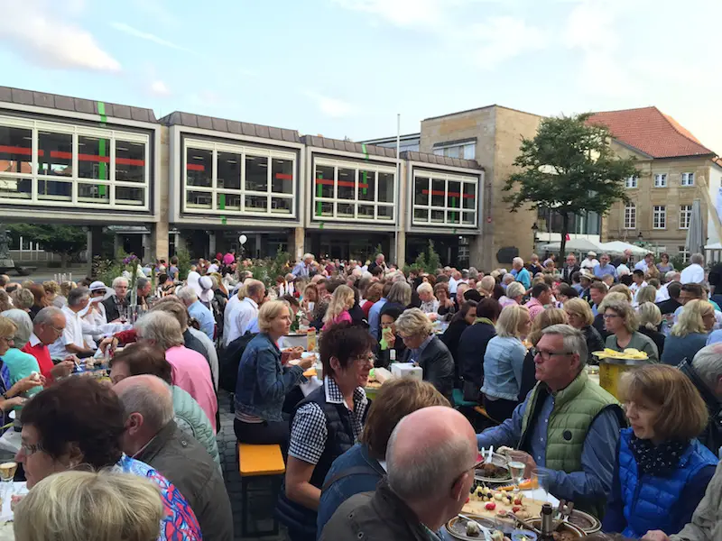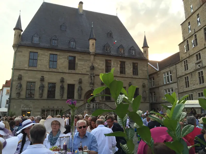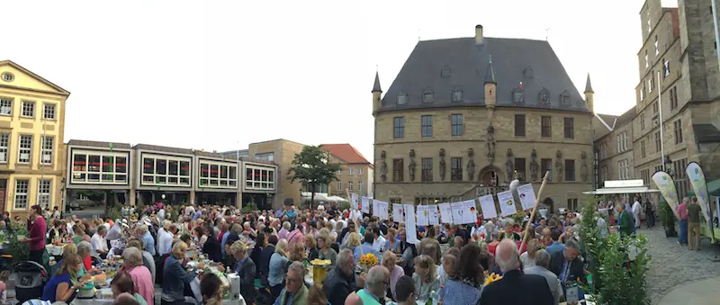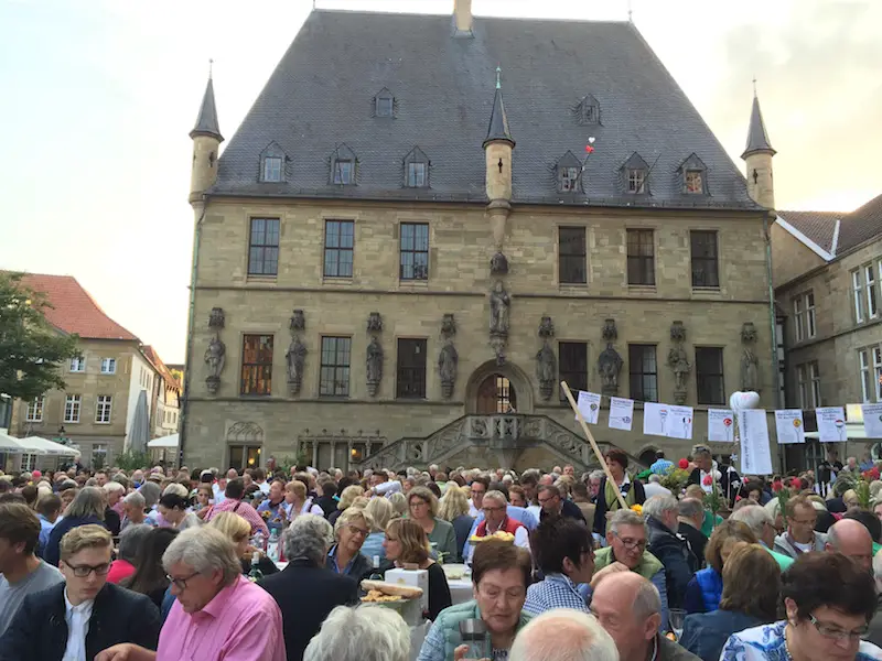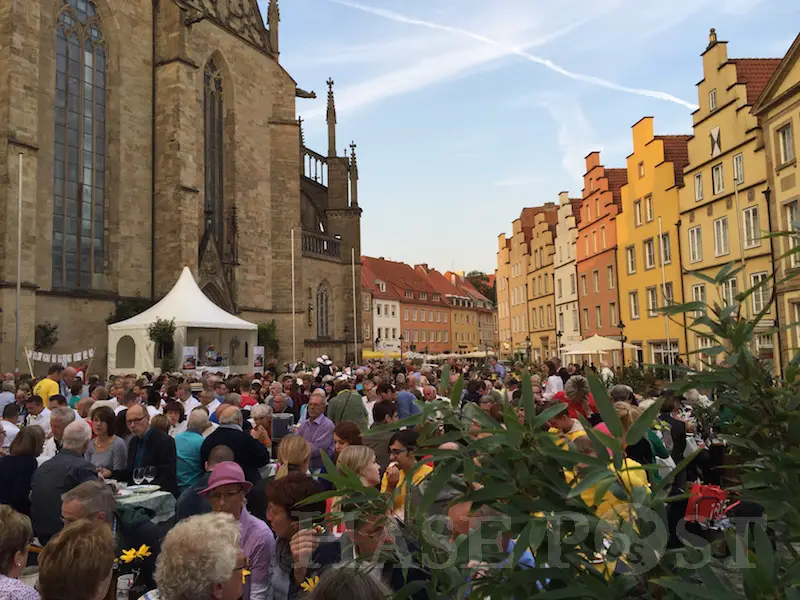 Freitagabend verwandelte sich der Marktplatz in einen Festplatz mit 70 Tischen. Die Osnabrücker Bürgerstiftung hatte Familien, Firmen, Clubs, Vereine, Freundeskreise, Praxen, Nachbarschaften eingeladen – und sie kamen zahlreich mit Picknickkörben, Tischschmuck und vor allem guter Laune.