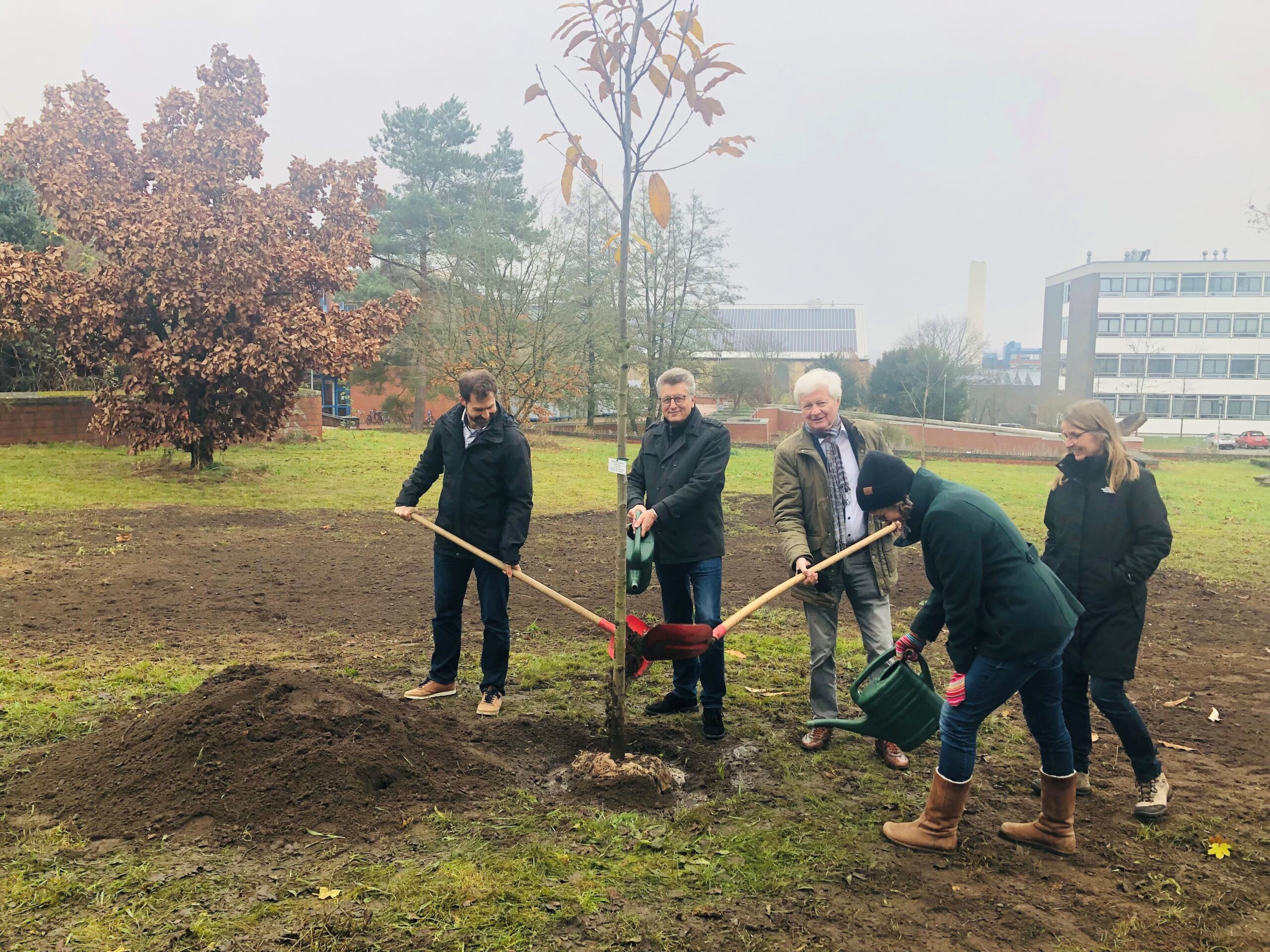 Zwei Esskastanien (Castanea sativa) wurden am vergangenen Mittwoch (17. November) in einer gemeinsamen Pflanzaktion mit den Stiftungen an der südlichen Grenze des Campus Westerberg im Übergang zur freien Landschaft an der Musenburg gepflanzt. Die Esskastanie ist nicht nur als Lieferant für Maronen bekannt, sondern wird im Forst auch als ein „Waldbaum der Zukunft“ angesehen. Dank ihrer mediterranen Herkunft kommt sie gut mit warmen Temperaturen zurecht und kann zudem auf trockenem Boden wachsen.