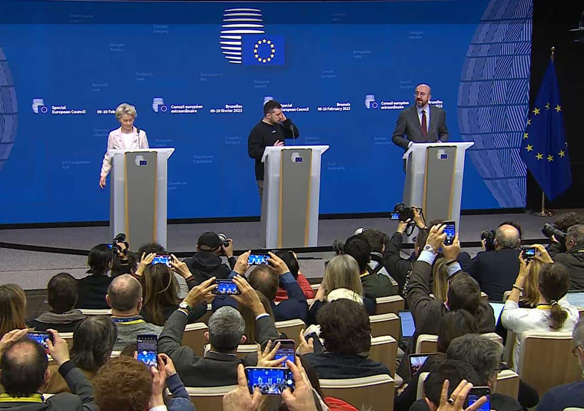 Die EU unterstütze einen „Friedensgipfel“, um die „territoriale Integrität“ der Ukraine wiederherzustellen, so der Ratspräsident. Er werde sich auch dafür einsetzen, dass der Rat seiner Verantwortung gerecht werde, was einen möglichen Beitritt der Ukraine zur Europäischen Union angehe. Die Ukraine habe hier bereits große Fortschritte gemacht, sagte Michel. „Russland muss einen Preis zahlen für die Zerstörung und das Blut, das vergossen wurde“, ergänzte EU-Kommissionspräsidentin Ursula von der Leyen. Die EU-Kommission werde in Kürze das zehnte Sanktionspaket vorschlagen, das sich gegen politische und militärische Führer aus Russland richten und Exportverbote beinhalten soll. Auch „Propagandavertreter“ Russlands würden verfolgt – ausdrücklich auf Anregung des ukrainischen Präsidenten hin. Schließlich werde bereits über die Einrichtung eines Gerichtes beraten, um den Krieg aufzuarbeiten, sagte von der Leyen.