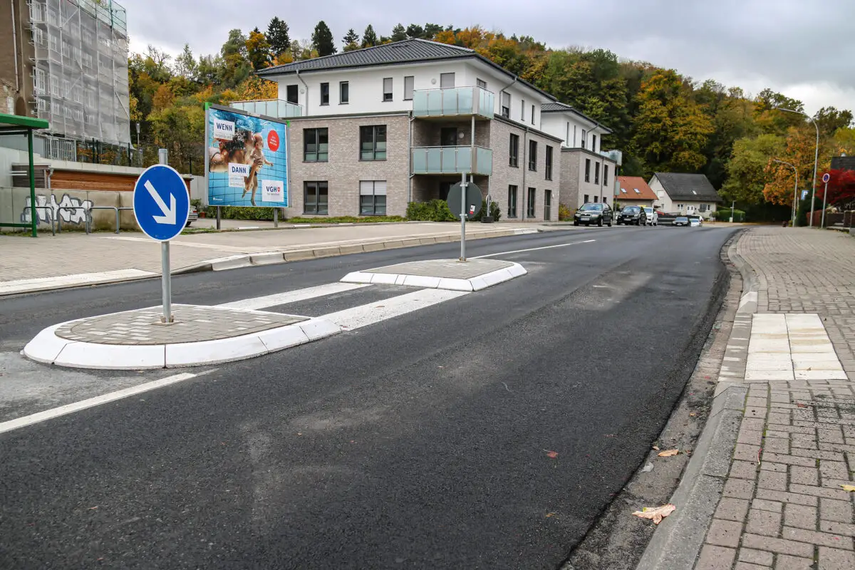 Um möglichst effizient vorgehen zu können, wurde der gesamte Abschnitt in einem Zug gesperrt und saniert. Ziel der Maßnahme war es, sowohl die Asphalttragschicht, als auch die Asphaltdeckschicht zu erneuern, um so Schadstellen auszubessern. Dafür musste auch die Querungshilfe im Bereich der Karlstraße zunächst entfernt werden: „Den Neuaufbau der Querungshilfe haben wir dann auch genutzt, um diese besser mit den taktilen Leitelementen auf den angrenzenden Gehwegen zu verbinden“, so Baumann.