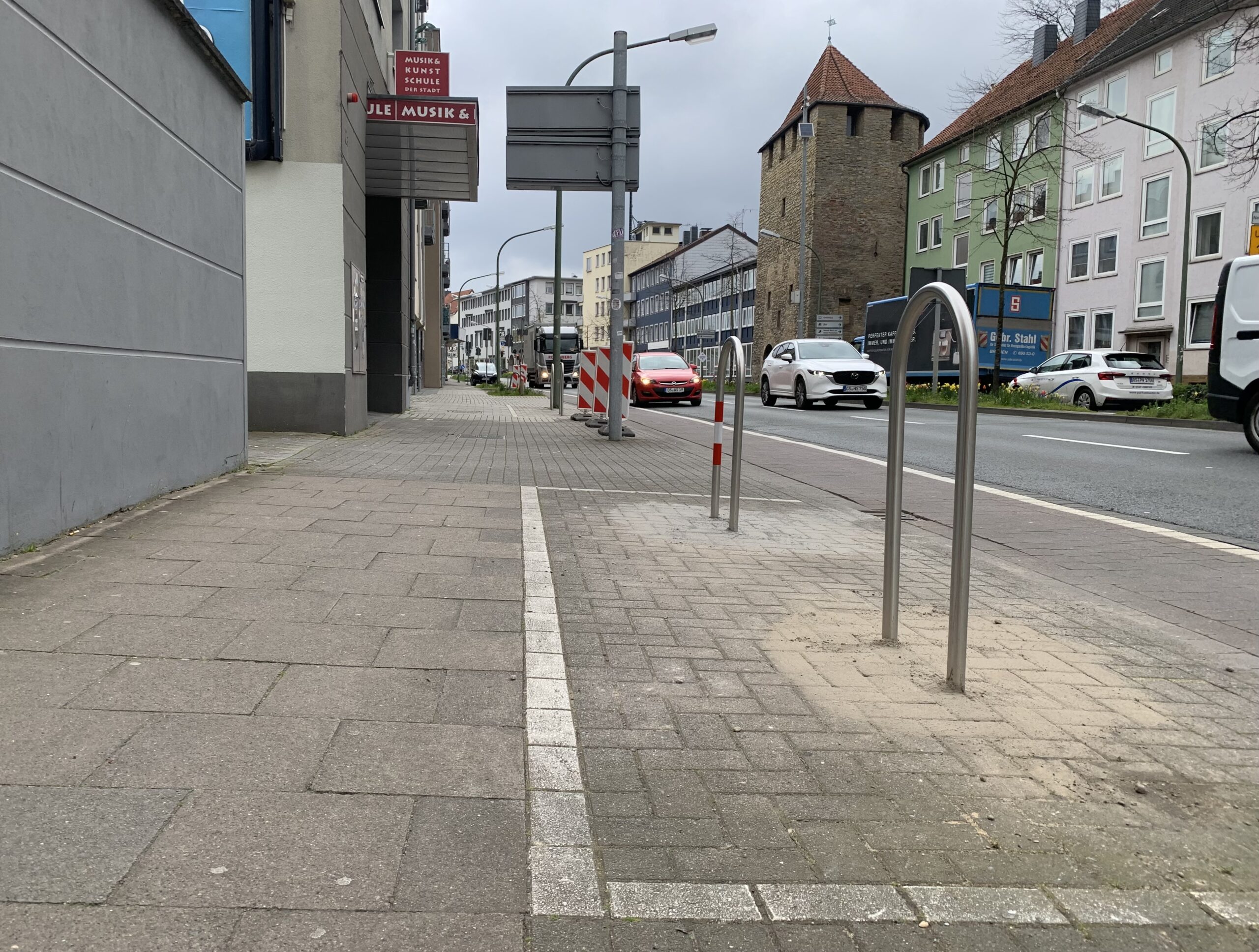 Bereits Mitte April brachte die Stadt an neun bisherigen PKW-Parkplätzen entlang des Johannistorwalls teils Fahrradbügel, teils provisorische Sperrbaken an. „Hintergrund ist, dass die Gefahr von Dooring-Unfällen dort aufgrund des schmalen Radfahrstreifens deutlich erhöht war“, erklärt ein städtischer Sprecher dazu.