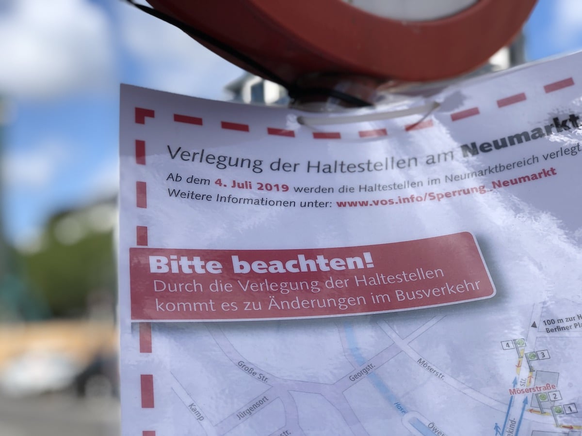 Blöd war die ganze Angelegenheit vor allem für die Stadtwerke, denn die hatten in monatelanger Kleinarbeit ihr Liniennetz und den Fahrplan so umgestellt, dass dieser für die geplanten Bauarbeiten den Neumarkt umfährt. Nun gibt es aber keine Baustelle am Neumarkt, die Busse fahren trotzdem drumherum.