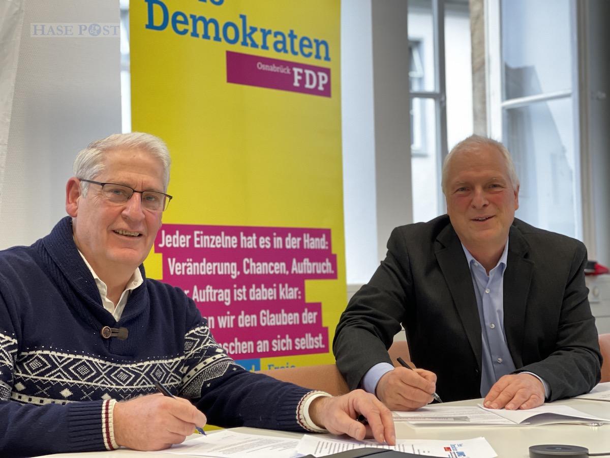 v.l. Wulf-Siegmar Mierke (UWG) und Dr. Thomas Thiele (FDP) unterzeichnen eine Vereinbarung für die die laufende Legislaturperiode im Rat der Stadt Osnabrück. /Foto: Pohlmann