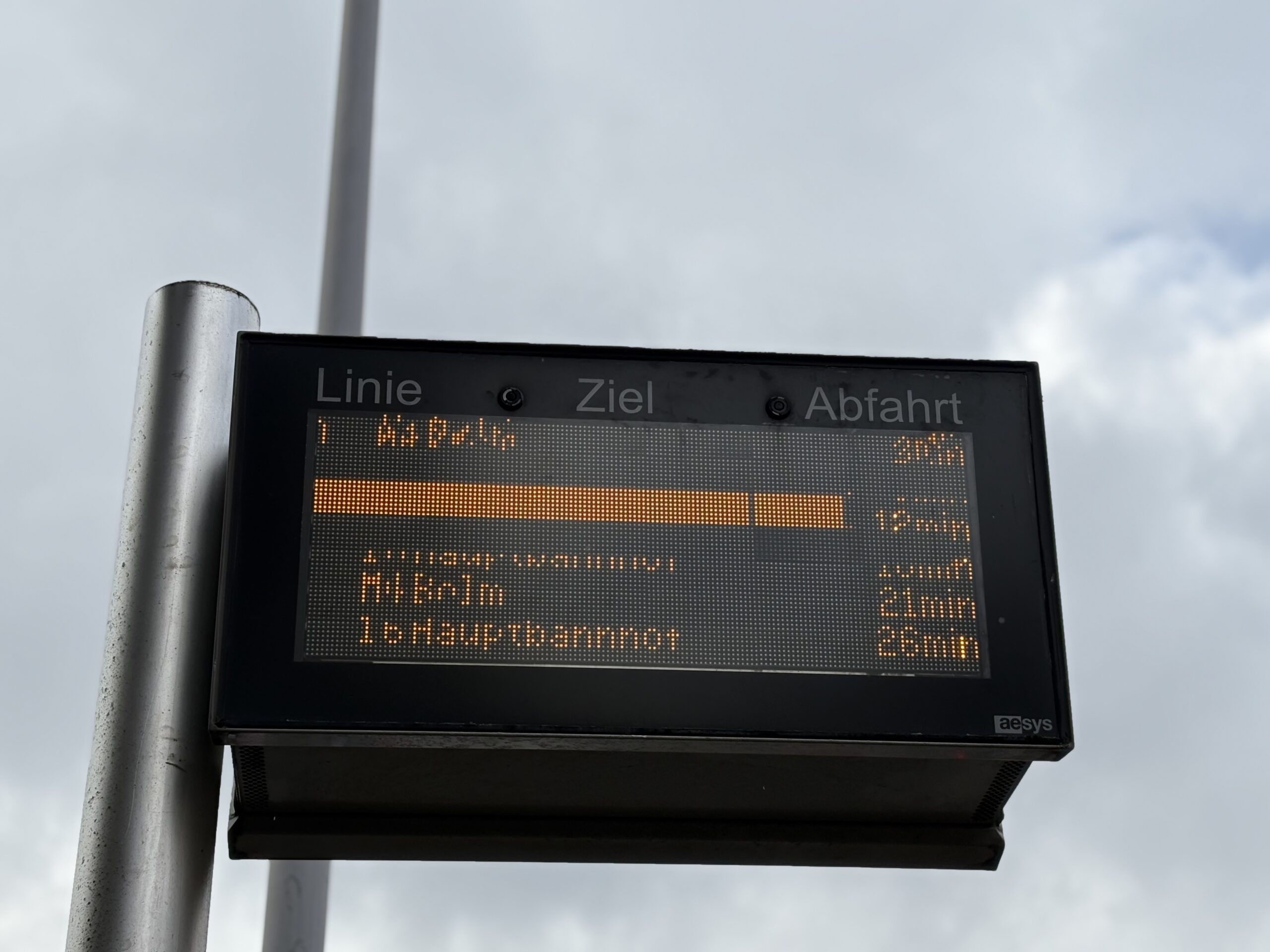 Ein besonderes Bild zeigt sich am Heinrich-Lübke-Platz, direkt vor dem Aldi-Markt. Hier ist nicht nur (wie so oft) der nächste Bus unlesbar verpixelt, auch die danach folgenden Busse sind aufgrund mysteriöser Bildfehler nicht zu identifizieren. Apropos mysteriös: Wohin fährt eigentlich die Buslinie Nirgendwo? Rettung naht hier nur auf der Rückseite der Anzeigetafel, die glücklicherweise funktioniert.