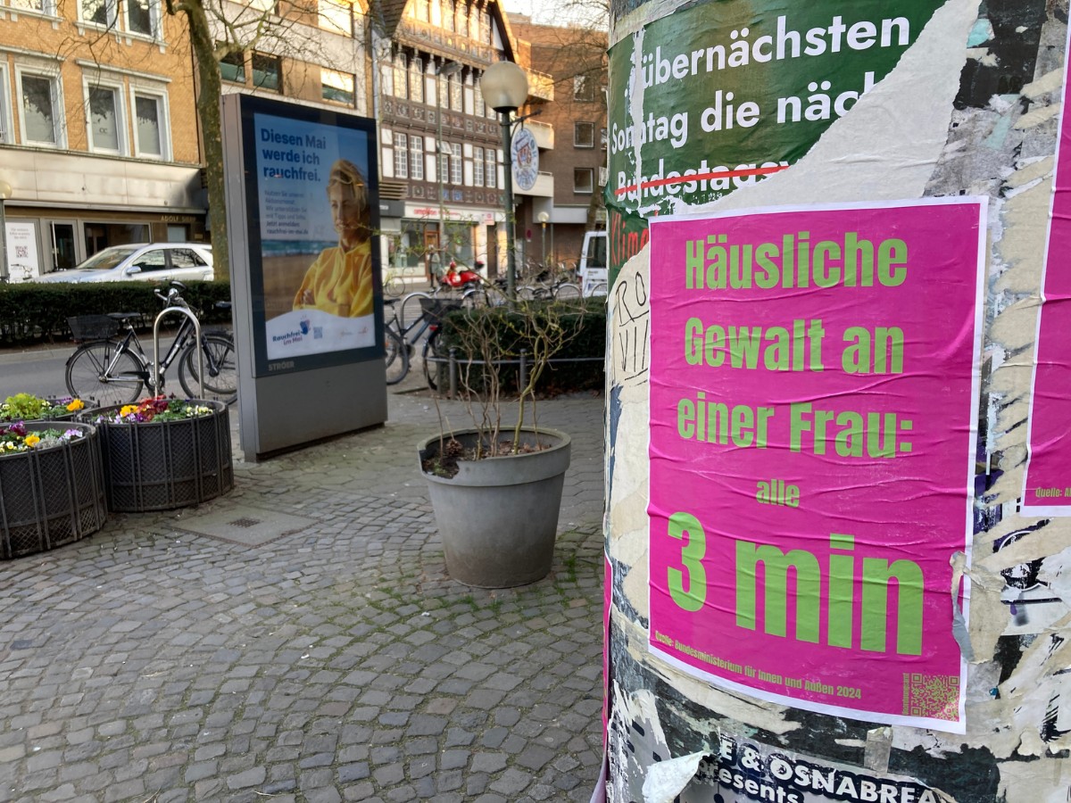 Seit wenigen Tagen prägen Plakate das Stadtbild der Osnabrücker Innenstadt. Verantwortlich für die Aktion ist das so genannte „Unordnungsamt“, eine Aktivistengruppe, die im Rahmen des Feministischen Frühlings auf bestehende Ungleichheiten zwischen Männern und Frauen aufmerksam machen will und in einer Mitteilung von knapp 200 Plakaten spricht. Die Plakate zeigen alarmierende Statistiken zu Themen wie Gewalt gegen Frauen und Geschlechterverhältnisse in der Arbeitswelt.