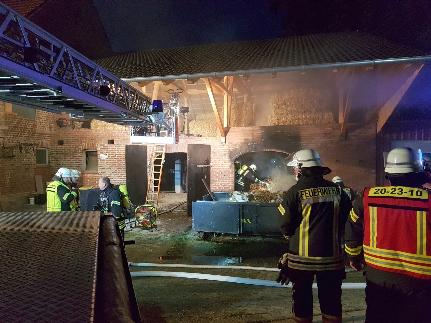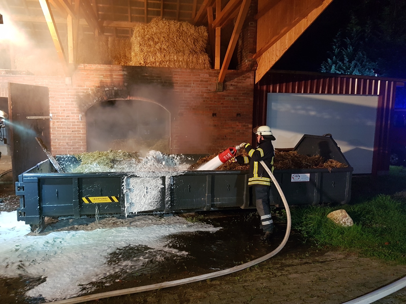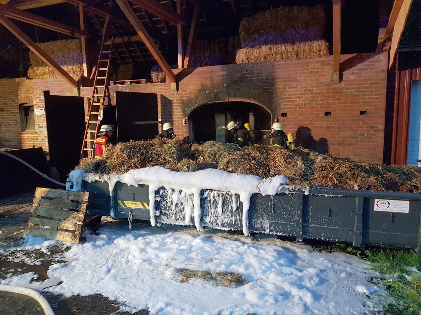 Um das Stroh ablöschen zu können, musste es mit Forken auseinandergezogen werden. Ein vor dem Gebäude abgestellter Container konnte zum Umlagern und schrittweisen Ablöschen genutzt werden. Fünf Trupps mit schwerem Atemschutz waren damit beschäftigt, bis nach rund anderthalb Stunden die Löscharbeiten erfolgreich beendet werden konnten.