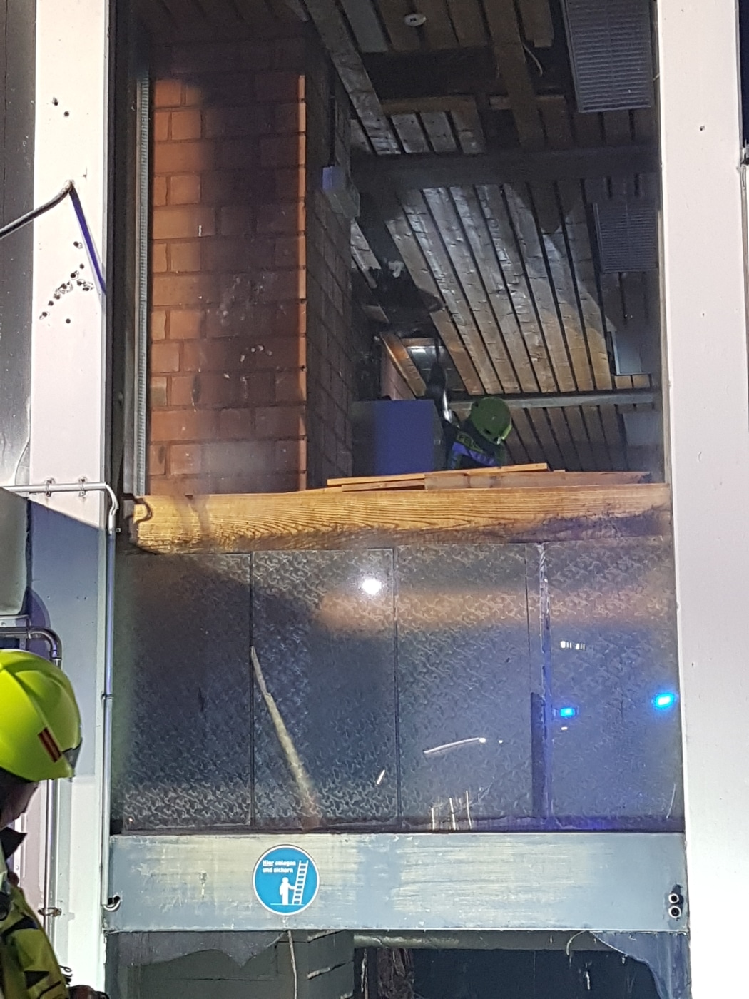 Beim Eintreffen fand die Feuerwehr eine starke Verqualmung im Bereich des Turnhallengebäudes vor, in dem ein Verteilerkasten nahezu in Vollbrand stand. Sofort wurde ein Trupp unter Atemschutz zur ersten Brandbekämpfung eingesetzt. Neben dem Verteilerkasten mussten auch abgehende Kabel abgelöscht werden. Entlang der Kabel öffneten weitere Kräfte die Decke im Eingangs- und Flurbereich sowie an der Tribühne, um zu kontrollieren ob sich der Brand dorthin ausgebreitet hatte. Glücklicherweise war dies nicht der Fall.