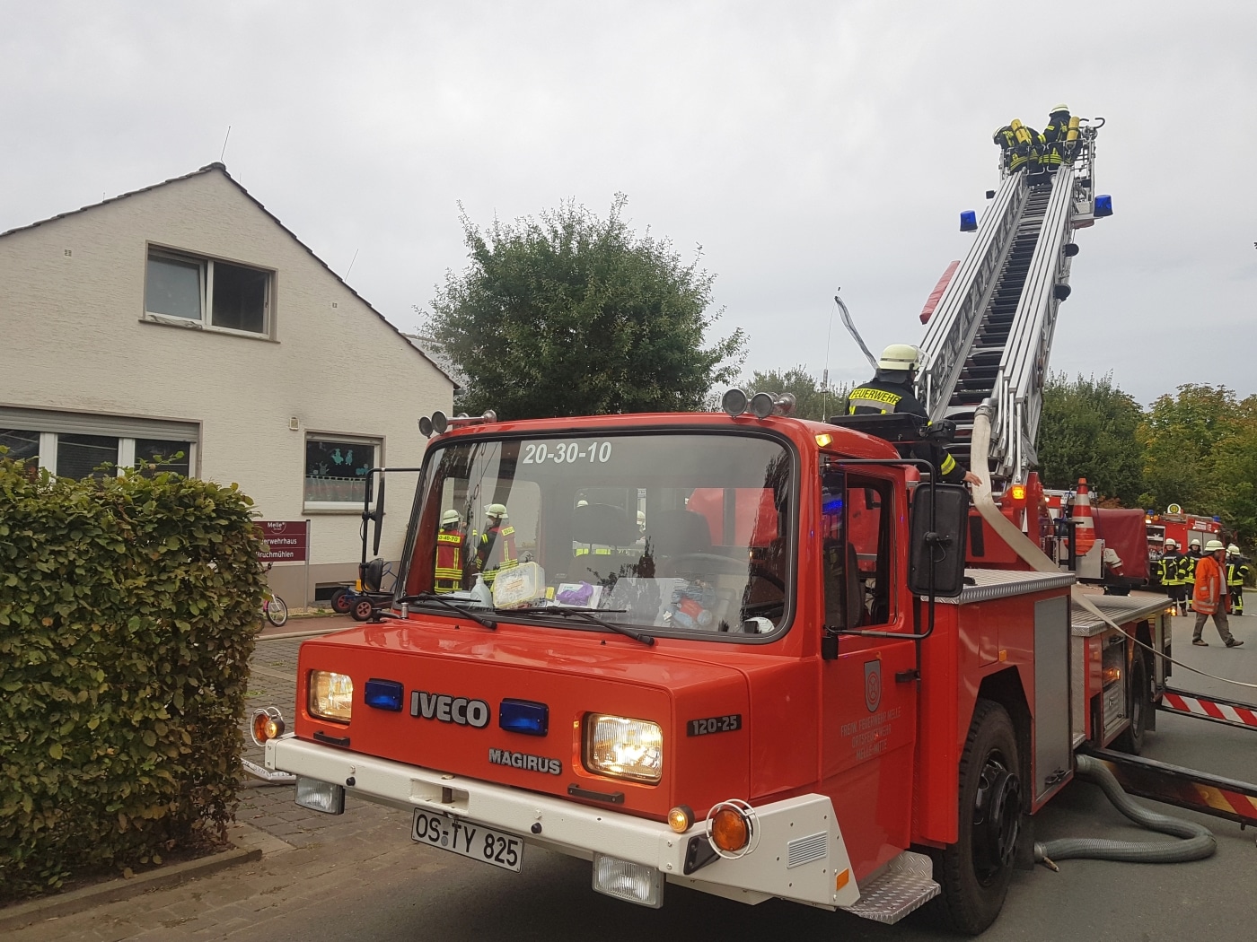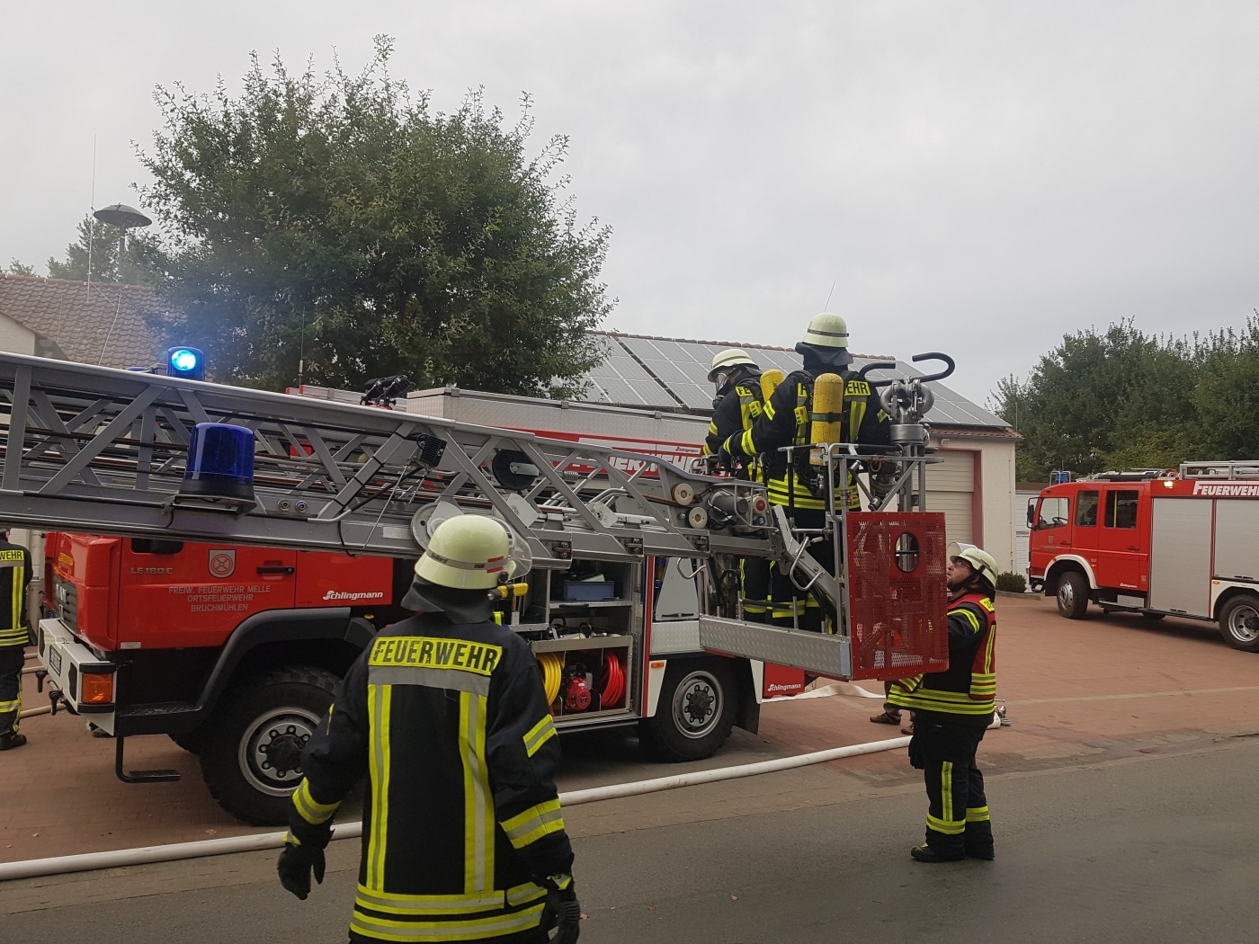 Gegen 17:30 wurden die Feuerwehr gerufen. Sie rückte mit der Ortsfeuerwehr Bruchmühlen, der Alarmeinheit der Ortsfeuerwehren Riemsloh, Hoyel und Groß-Aschen sowie der Drehleitereinheit Melle-Mitte aus. Auch der Rettungsdienst wurde zur Einsatzstelle geschickt.