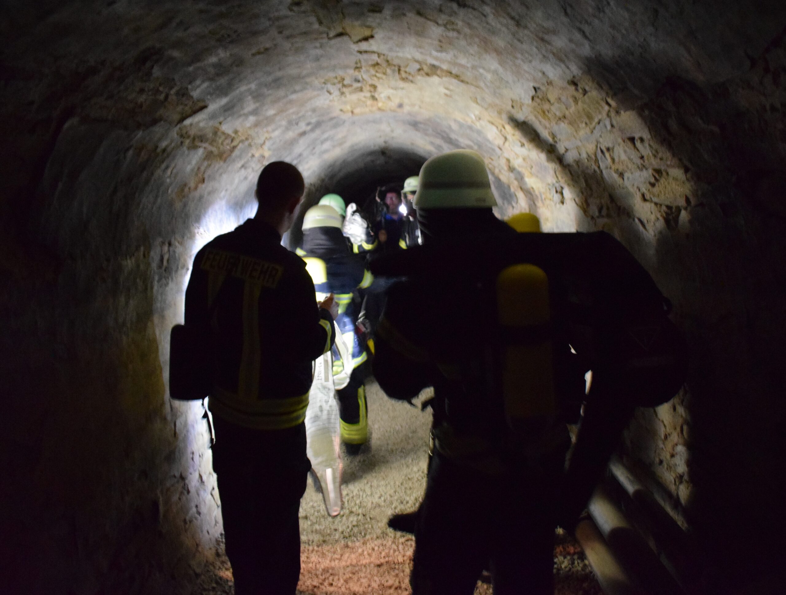 Für die Übung wurde die Gruppe aufgeteilt. „Die Hälfte der Feuerwehrleute kommt von oben die 30 Meter lange Treppe herunter und soll das Löschen eines Stromkastens simulieren. Die andere Hälfte muss den 300 Meter langen Stollen nach einem Dummy durchsuchen, diesen bergen und dann die 300 Meter wieder zurück ans Freie bringen“, erklärt Erwin Thöle. Die Feuerwehrleute sind dafür immer in Zweierteams unterwegs. „Die ganze Übung läuft heute sechs mal ab. Nach der Hälfte wird getauscht, damit jedes Team beides gemacht hat“, so Thöle. Beide Übungen laufen parallel ab. „Kommunikation ist das Wichtigste“, berichtet Daniel Middendorf, angehender Feuerwehrmann. „Mit dem eigenen Trupp, mit dem Truppenführer, mit dem Trupp draußen – es geht alles nur im Team.“