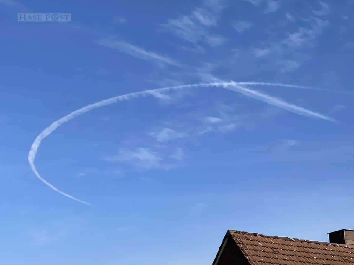 Am sonnig blauen Frühjahrshimmel waren in den vergangenen Tagen oft Kondensstreifen am Himmel über der Hasestadt zu sehen, die teils über Stunden auf kreisende Flugzeuge in sehr hoher Flughöhe hindeuteten. Auch am Mittwochvormittag, gegen 10 Uhr, zeigte sich erneut ein solcher auffälliger Kreis etwas nordwestlich der Innenstadt.