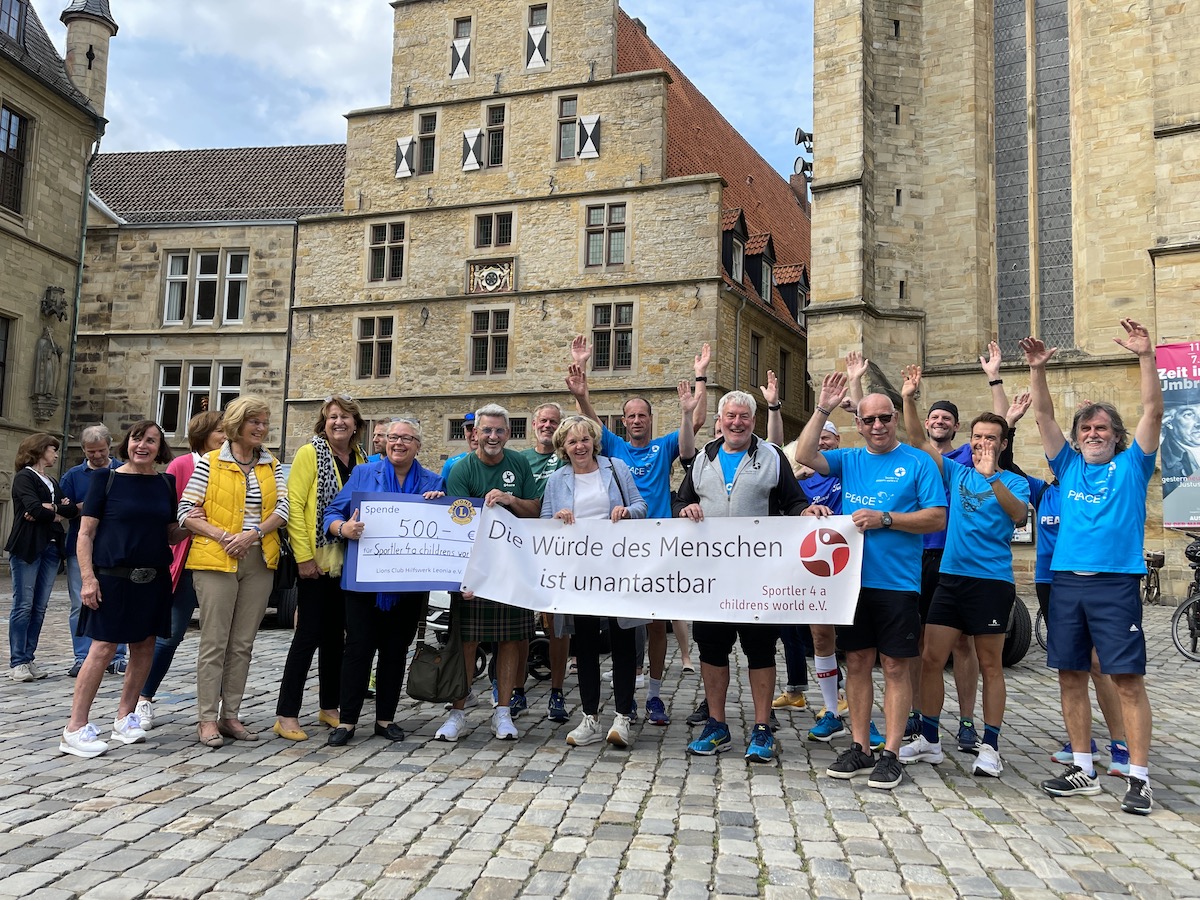Unter dem Motto „Die Würde des Menschen ist unantastbar“ findet der diesjährige Friedenslauf statt. Die wohltätige Organisation „Sportler 4 a childrens world“ hilft Kindern, die von anderen Menschen im Stich gelassen worden sind. Niemand wird dabei ohne Hilfe gelassen. Um den Verein und ihre Arbeit finanziell zu unterstützen, überreichte der Lions Club Leonia Osnabrück dem Gründer von „Sportler 4 a childrens world“, John McGurk, einen Scheck in Höhe von 500 Euro.