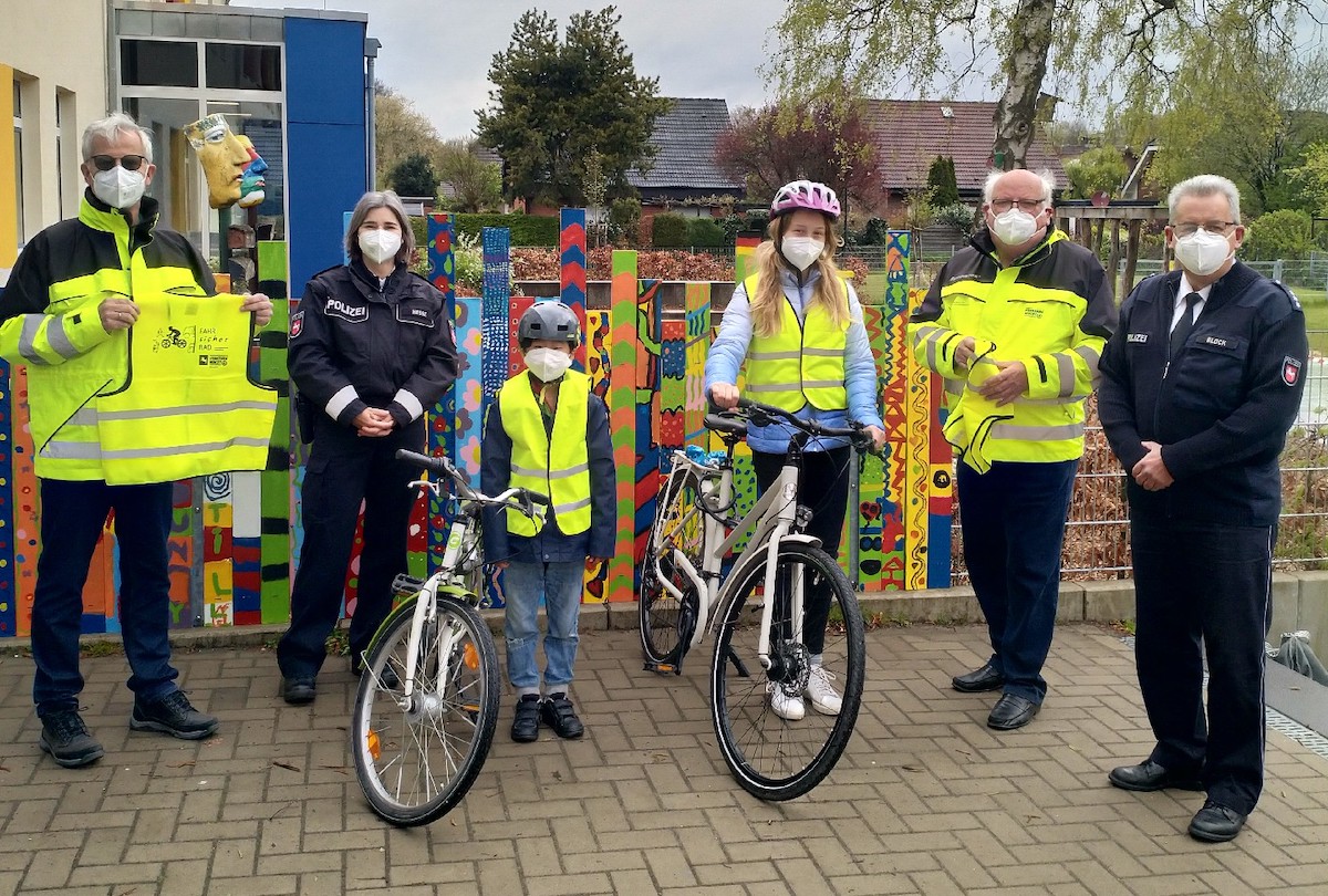 Zum Auftakt des bundesweiten Aktionstages und dem Schwerpunktthema der Polizeiinspektion Osnabrück „Fahr sicher Rad“, gab es am 4. Mai 2021 eine besondere Überraschung für die Viertklässler der Grundschule Sutthausen. Dank einer großzügigen Spende der Verkehrswacht der Stadt Osnabrück konnte das Präventionsteam der Polizeiinspektion Osnabrück neongelbe Sicherheitswesten an die Schülerinnen und Schüler verteilen. Mit Beginn der Sommerferien sollen alle teilnehmenden Viertklässler mit Sicherheitswesten ausgestattet sein.