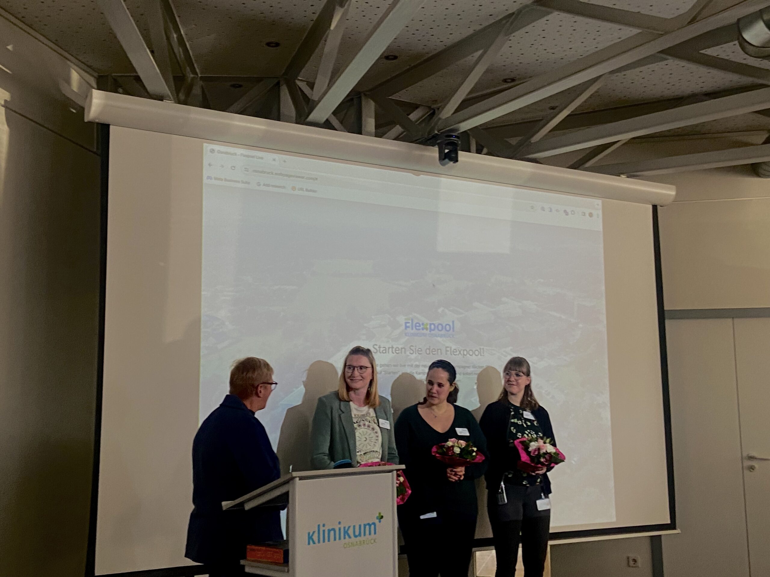 Pflegedirektorin Atrat bedankt sich bei den Mitarbeiterinnen des Flexpools Karin Salwolke, Alexandra Pütz und Neele Heinze (von links). / Foto: Hannah Meiners