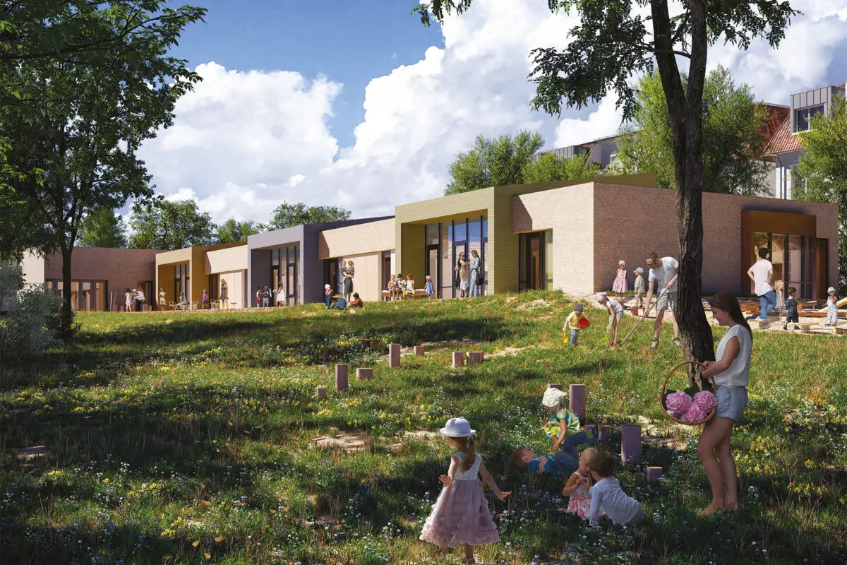 Von außen wechseln sich gemäß der Planung das optisch an die historische Bausubstanz in der Umgebung angepasste Verblendmauerwerk und farblich akzentuierte Holzelemente miteinander ab. Letztere umrahmen insbesondere die größeren Fensterfassaden an den Gruppenräumen. Auf dem Dach sorgen Begrünungselemente sowie eine Photovoltaik-Anlage für ein Plus in der Nachhaltigkeitsbilanz. So auch die Erdwärme, die in Kombination mit einer Wärmepumpe das Gebäude mittels Fußbodenheizung beheizen wird. Diese Heizmethode war zuvor nicht Bestandteil der Vorentwurfsplanung gewesen, sondern wurde aufgrund eines politischen Beschlusses im Planungsprozess gegenüber dem ursprünglich geplanten Blockheizkraftwerk ausgetauscht. Auch die Gebäudefläche hat sich – neben einigen weiteren Anpassungen im Bereich der haustechnischen Anlagen – vom damaligen Wettbewerbsbeitrag bis zum Ende der Leistungsphase III verändert, sodass insgesamt nun 85 Quadratmeter Brutto-Grundfläche mehr zur Verfügung stehen.