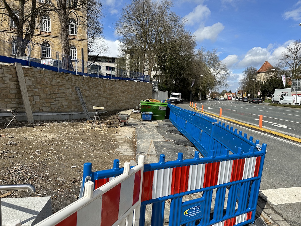 Doch um den Fertigstellungstermin Anfang Mai halten zu können, wird noch immer an einer Wand zum Wallring gearbeitet. Daher müssen Fußgänger weiterhin auf die gegenüberliegende Straßenseite ausweichen, wenn Sie von der Lotter Straße zum Stadthaus wollen.