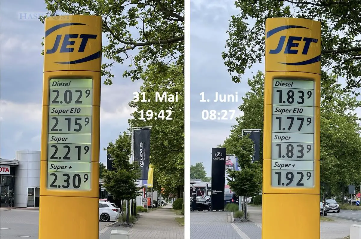 Die Preissenkung ist zudem deutlich größer als die allgemein angenommenen 20 Cent pro Liter. Bereits im Vorfeld wurde bekannt, dass durch Effekte bei der Mineralöl- und Mehrwertsteuer rein rechnerisch eine Entlastung bei 35,2 Cent pro Liter Benzin und 16,7 Cent pro Liter Diesel zu erwarten sind. Die am Morgen des 1. Juni festgestellte Preissenkung zeigt, dass auch dieser Booster-Effekt an die Verbraucher weitergegeben wird.