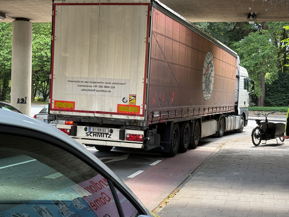 Noch einmal mit dem Schrecken davongekommen ist die Fahrerin eines Lastenrades, die in Kontakt mit einem nach rechts abbiegenden osteuropäischen Sattelzug kam.