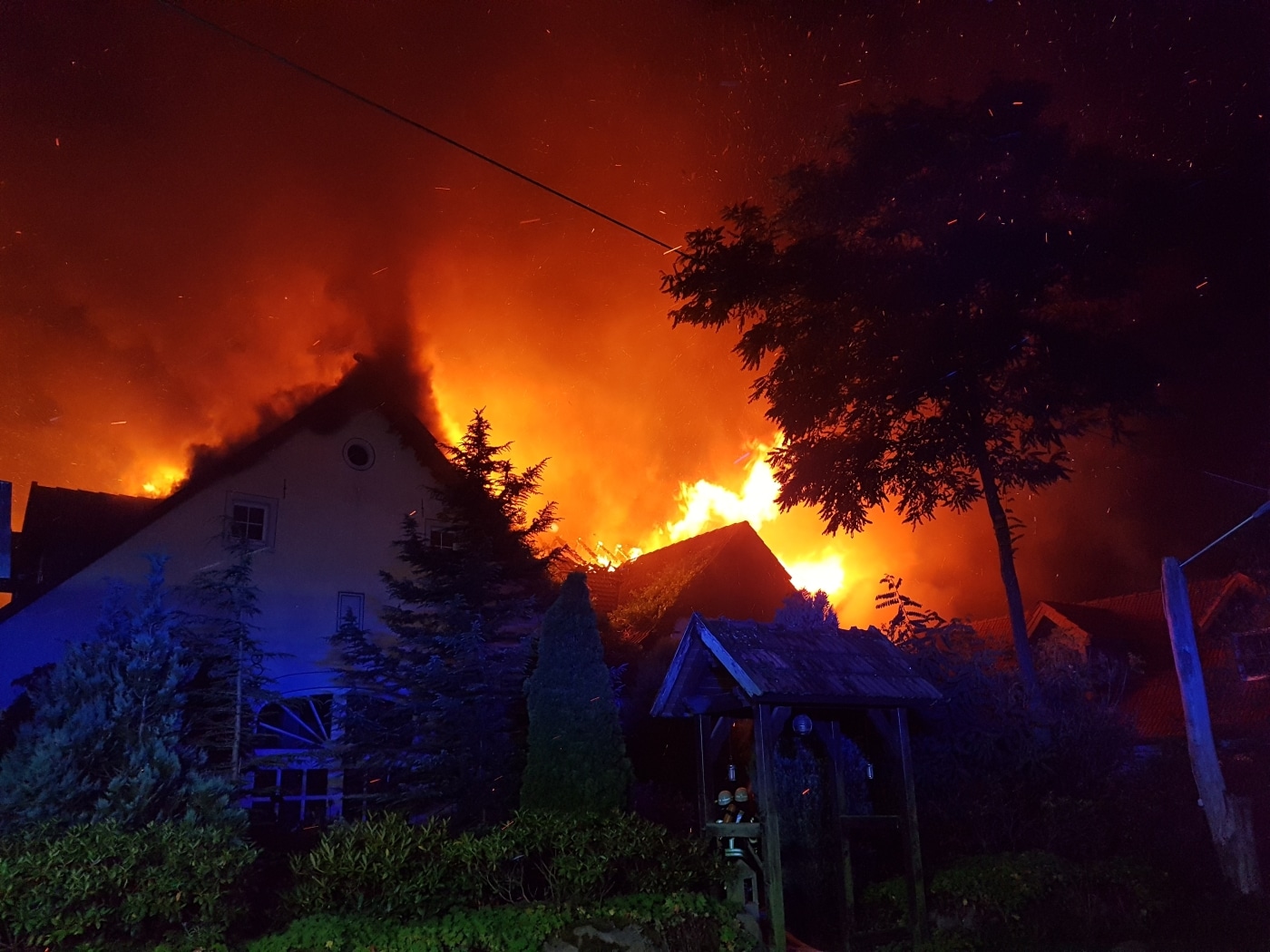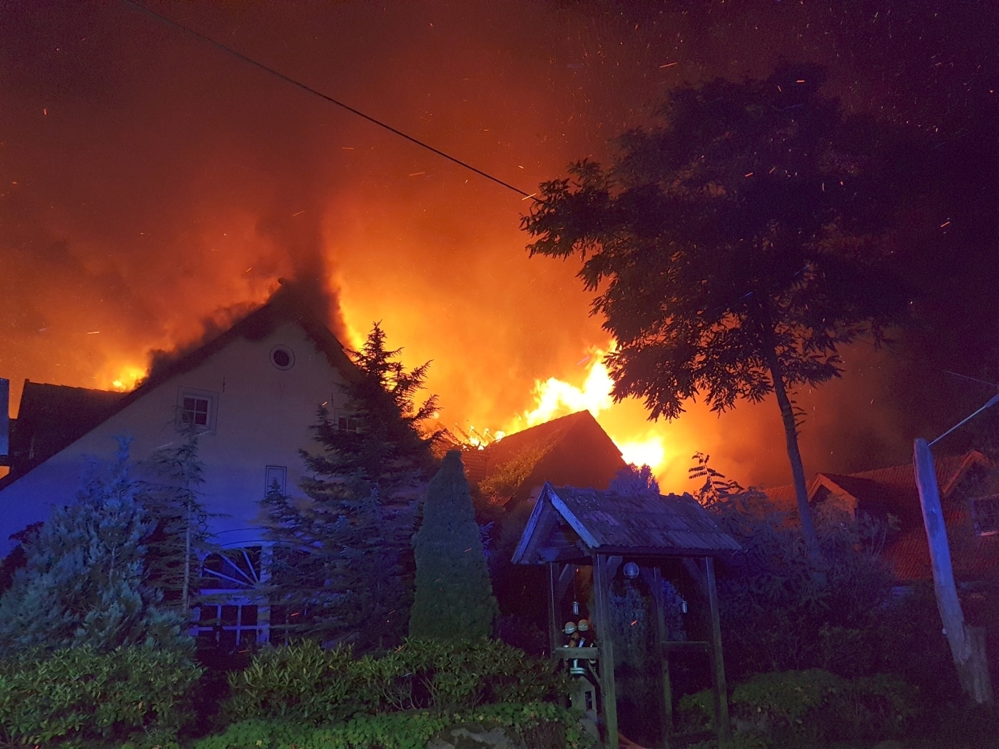 Als die Einsatzkräfte eintrafen, stand der Dachstuhl bereits im Vollbrand. Der Feuerschein war weit sichtbar. Vor Ort herrschte starker Funkenflug und es kam mehrmals zu Durchzündungen.