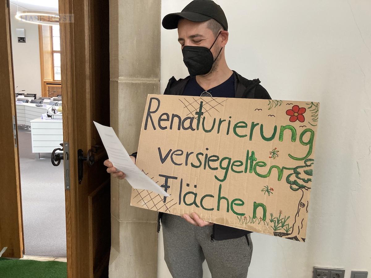 Vor dem Sitzungssaal des Stadt- und Entwicklungsausschusses (StuA) versammelten sich am Donnerstagabend (16. September) rund 20 Unterstützerinnen und Unterstützer der Grünen Finger und sangen ein Schutzlied* für diese. Mit Erfolg: Der Ausschuss entschied positiv über den Änderungsantrag, der am 27. September in der Ratssitzung dann endgültig verabschiedet werden soll.