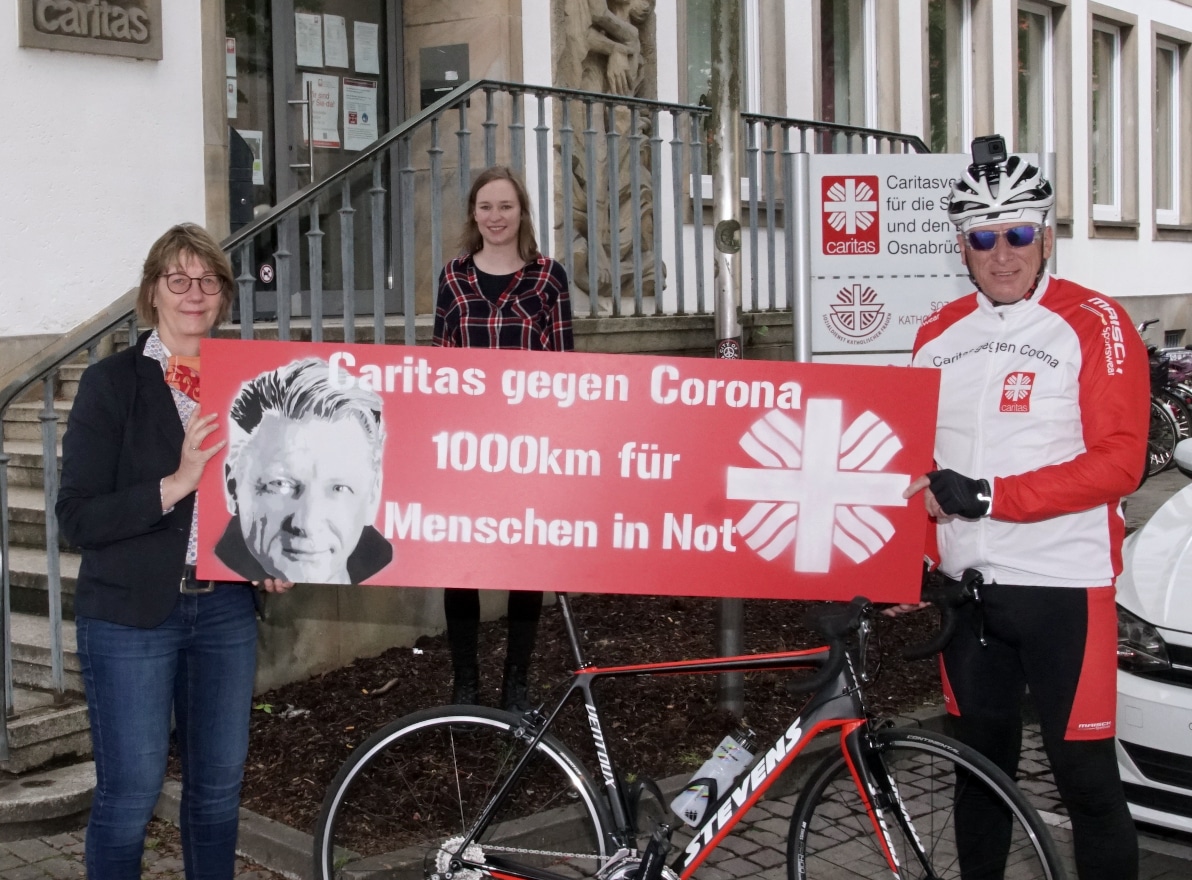 Morgens, 9:30 Uhr vor dem Carl-Sonnenschein-Haus, der Geschäftsstelle des Osnabrücker Caritasverbandes. Ludger Abeln ist guter Dinge, obwohl eine harte Woche vor ihm liegt: 1.000 km mit dem Fahrrad in sieben Tagen. Abeln erläutert seine Idee in knappen Sätzen: „Wenn wir uns schon mit persönlichen Kontakten zurückhalten sollen, dann kann ich auch allein etwas bewegen!“ Der leidenschaftliche Rennradfahrer nimmt das wörtlich und tritt eine Woche lang in die Pedalen, um alle Regionen des Bistums Osnabrück zu besuchen. Unterwegs trifft er einige der Sponsoren, zudem besucht er Caritas-Einrichtungen – natürlich immer unter Wahrung der Hygiene- und Abstandsvorschriften.