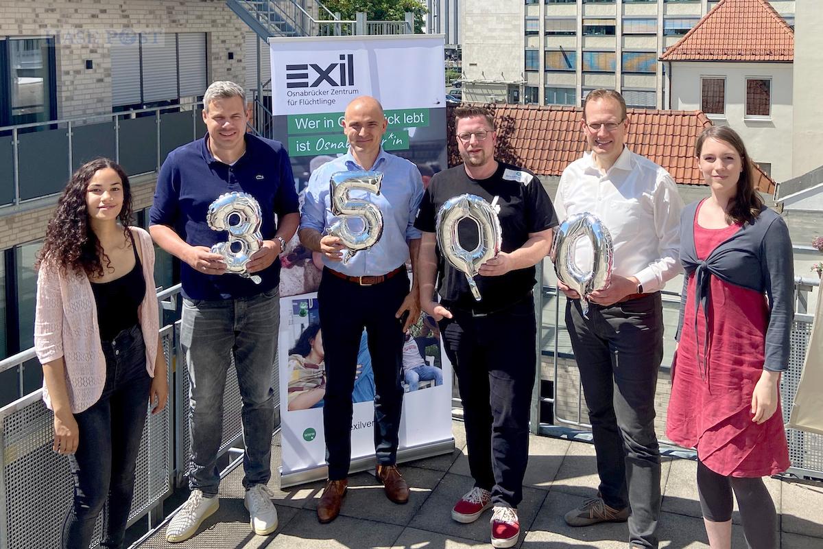 Noura Mahmoud (l.) und Sara Josef (r.) von Exil freuen sich über 3.500 Euro für „FreiZeit für junge Geflüchtete“. Die Vorstandsmitglieder des 1. OSC Eddie the Eagle, Michael de Vries, Christian Grzenkowski, Marc Prasse und Gunnar Schwender (v.l.), brachten statt Spendenscheck Luftballons in der Exil-Geschäftsstelle vorbei. / Foto: Exil, Marlene Schriever
