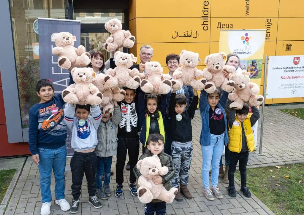 Rund 700 Menschen aus 33 Nationen leben derzeit in den Häusern der Erstaufnahmeeinrichtung für geflüchtete Menschen an der Sedanstraße in Osnabrück – darunter auch 203 Kinder. Das Erich-Maria-Remarque-Haus bietet auf dem Gelände der Erstaufnahmeeinrichtung ein von der Diakonie organsiertes pädagogisches Angebot für drei- bis zwölfjährige Kinder. „Bei diesen Bären ist das Alter der Kinder egal. Ob drei Jahre alt oder zwölf, die Kinder und Jugendlichen freuen sich sehr. Ihre Bären lassen sie nicht mehr aus den Augen“, so die Rückmeldung der Kinderbetreuung. „Wir sind der Bürgerstiftung Osnabrück sehr dankbar für die Aktion ‚Kinderwünsche‘, mit der dies möglich wurde. Unser neuer Bären-Vorrat wird vermutlich ein halbes Jahr reichen, je nachdem, wie viele Familien mit Kindern zu uns kommen werden.“