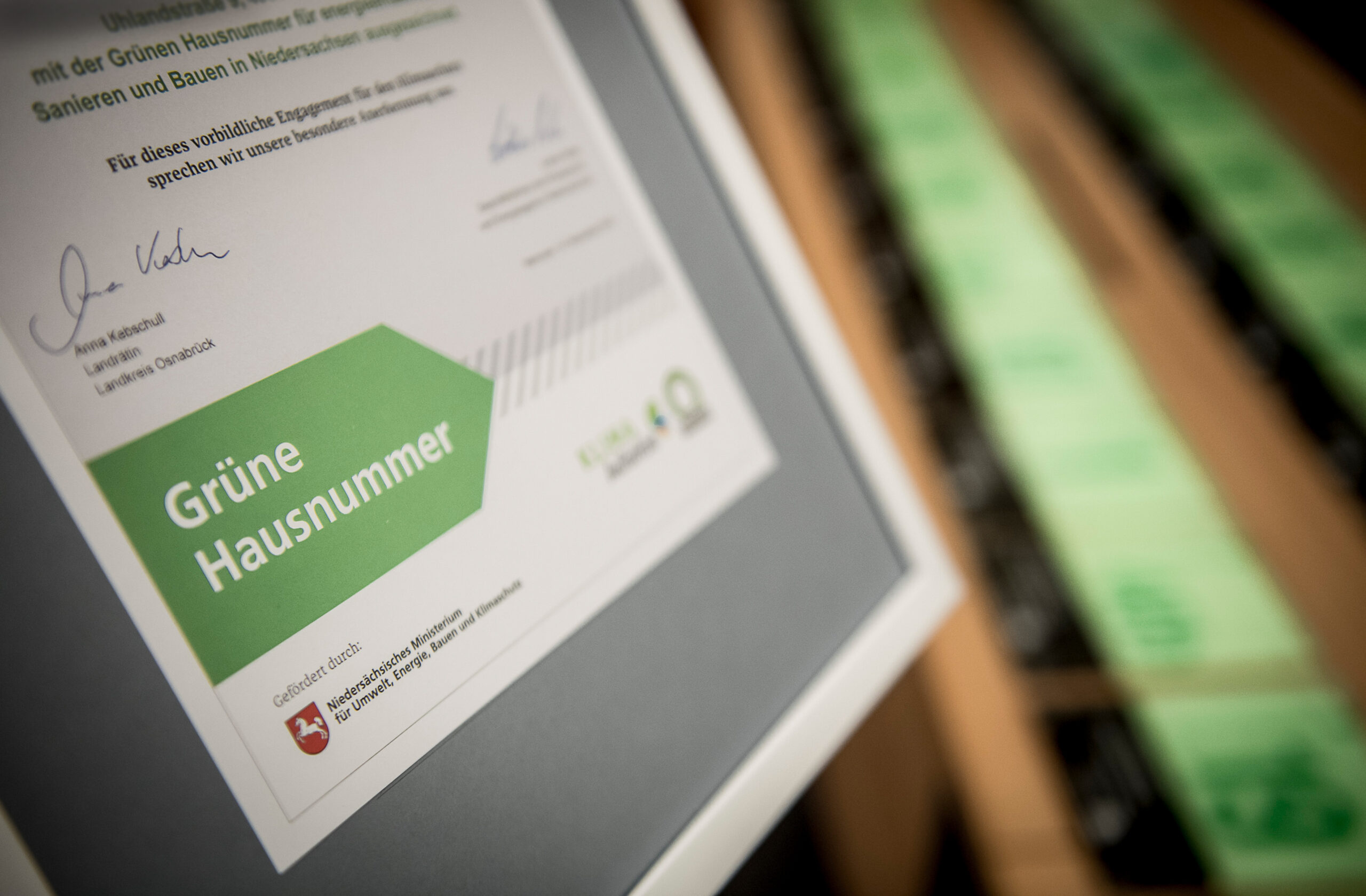 Urkunde für Hauseigentümerinnen und Hauseigentümer: Im Landkreis Osnabrück erhielten 16 besonders energieeffiziente Häuser die Grüne Hausnummer. / Foto: Aileen Rogge