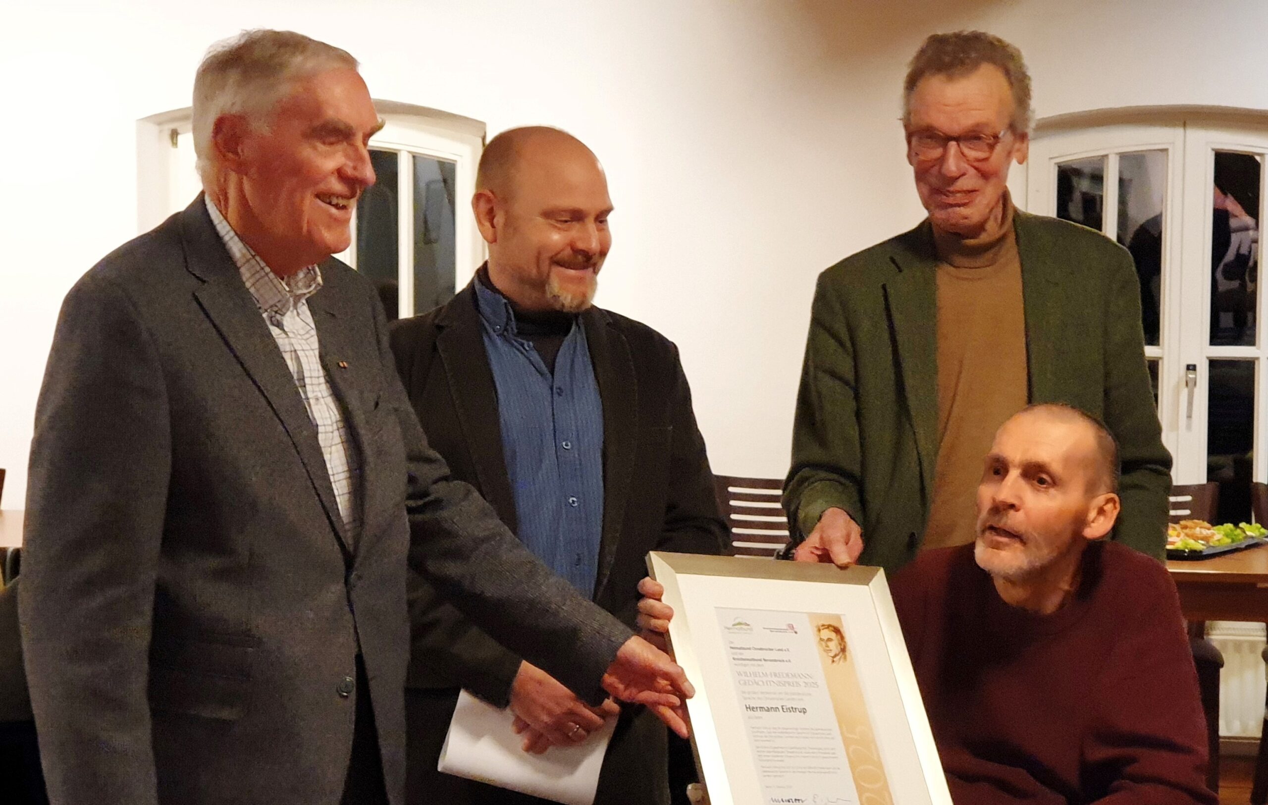 Nachdem Hermann Eistrup die Ehrenurkunde zur Verleihung des Wilhelm-Fredemann- Gedächtnispreises aus den Händen von Jürgen-Eberhard Niewedde und Franz Buitmann entgegengenommen hatte, dankte der Geehrte mit bewegten Worten für die Auszeichnung. Im Anschluss daran bereicherte Eistrup die Feierstunde mit einer vielbeachteten Lesung aus seinem Buch „Draumwelten“, das beim Onlineversandhändler Amazon mit dem Titel und dem Namen des Autors (also „Draumwelten“ und Hermann Eistrup) erhältlich ist.