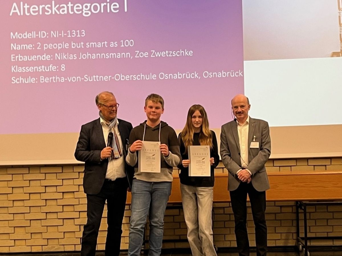Besonders stolz ist die Schule auf das Team von Niklas und Zoe, das sich mit seinem innovativen Modell unter 122 niedersächsischen Einsendungen durchsetzen konnte und einen hervorragenden 4. Platz belegte. Für diese Leistung wurden sie zur feierlichen Siegerehrung nach Hannover eingeladen – ein echtes Highlight!