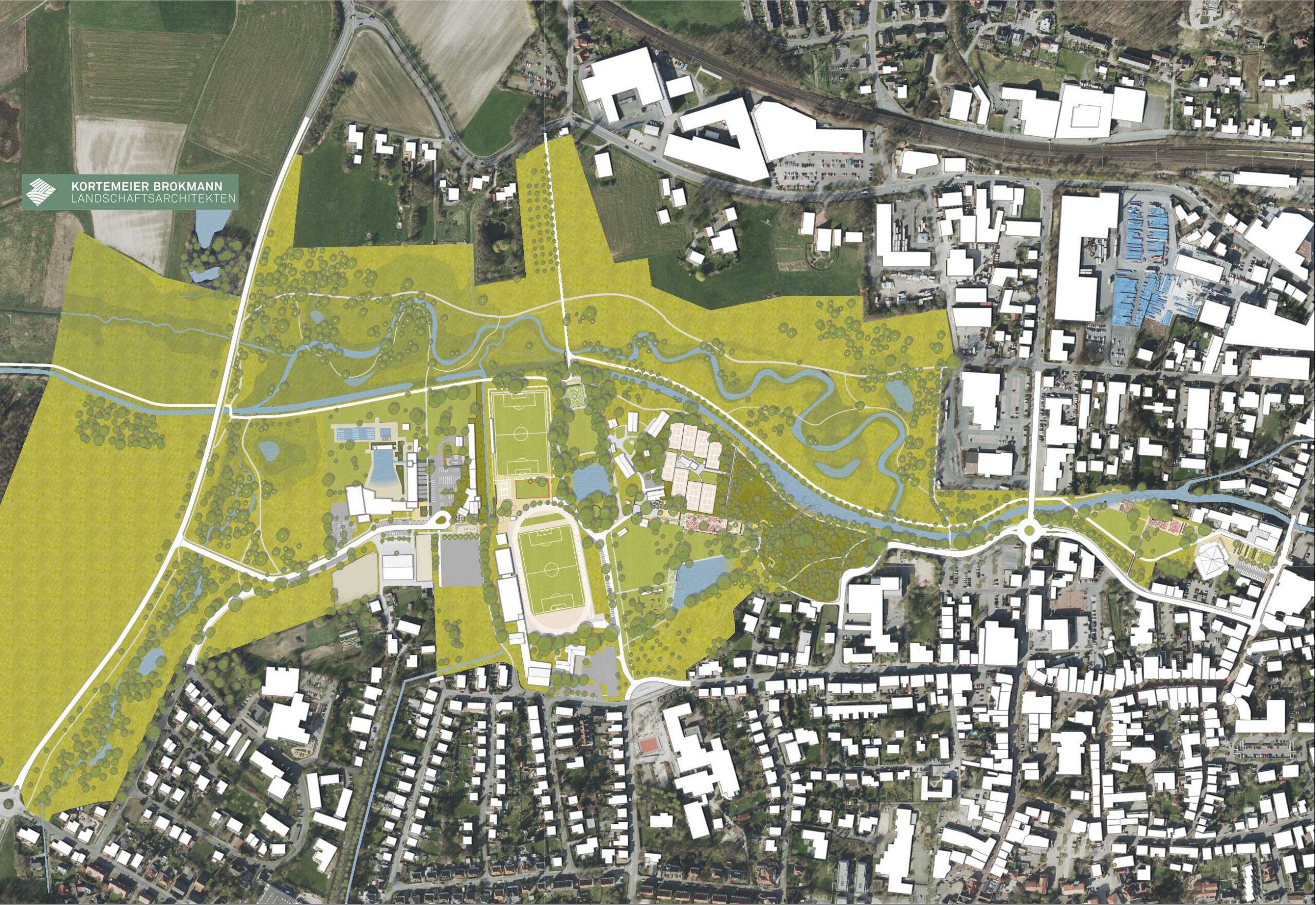 Für die Neugestaltung des Friedensgartens, des Grönenbergparks und des nördlich davon gelegenen Areals hat Ingenieurbüro Kortemeier Brokmann bereits eine Vorplanung erstellt, die im Rahmen der zweiten Bürgerbeteiligung im Detail vorgestellt werden soll. /Foto: Kortemeier Brokmann Landschaftsarchitekten GmbH