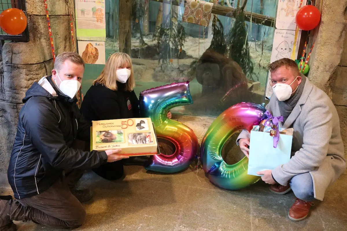 Bildunterschrift: Orang-Utan Buschi – mit vollem Namen Buschmann – feiert seinen 50. Geburtstag. Der Orang-Utan war der erste Menschenaffe, der im Zoo Osnabrück geboren wurde. Tobias Klumpe (zoologische Leitung), Heike Läkamp (Tierpflegerin) und Matthias Gehrmeyer (Geschäftsführer Gehrmeyer Orthopädie- und Rehatechnik und Buschis Hauptpate; v.l.n.r.) gratulieren Buschi zu seinem runden Geburtstag. / Foto: Zoo Osnabrück (Lisa Simon)