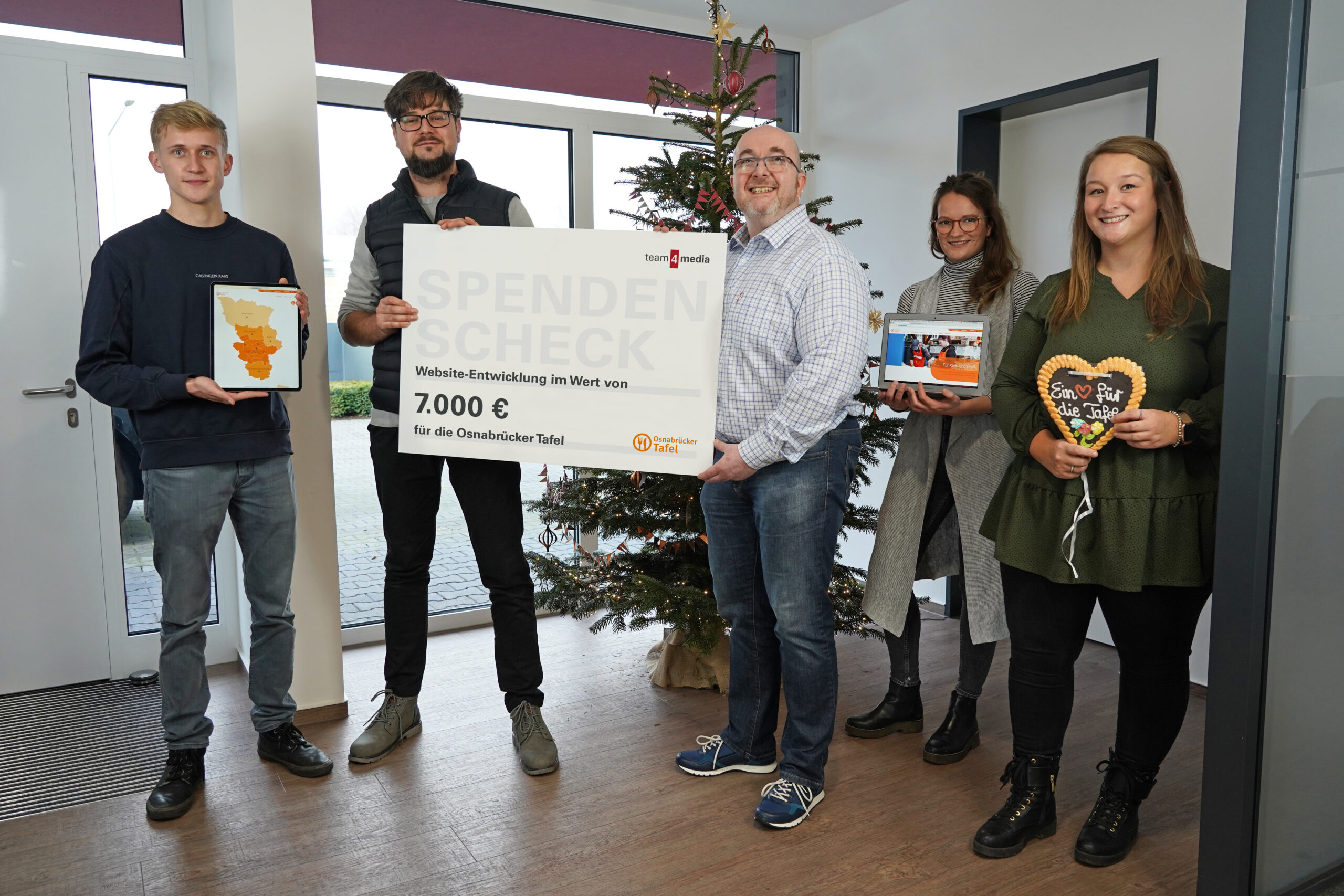 Übergabe des Spendenchecks an die Osnabrücker Tafel: (V. l. n. r.) Niklas Klinke, Dennis Wilken (Osnabrücker Tafel e. V.), Axel Voss, Franziska Prenzler und Jacqueline Bosse (team4media GmbH). /Foto: Osnabrücker Tafel e.V.