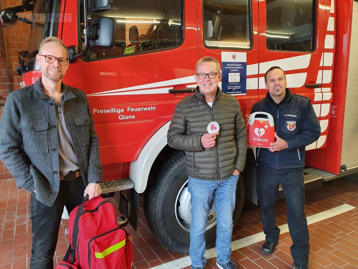 Frank Hengelbrock (Feuerwehrmann) wurde beim Zusammenbruch seines Bekannten Ralf E. (Mitte) durch die App der Mobilen Retter alarmiert und konnte ihm das Leben retten. Als Ansprechpartner beim Landkreis Osnabrück betreut Amin Schnieder (rechts) das Projekt der Mobilen Retter. / Foto: Landkreis Osnabrück
