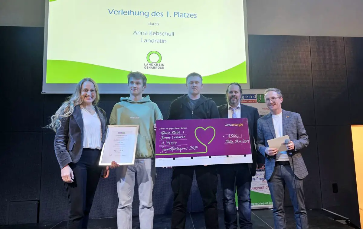 Bildunterschrift zum Titelbild: Anna Kebschull (Landrätin), Bennet Lennartz, Moritz Küthe, Torsten Schindler (Vorstandssprecher Jugendring) sowie Michael Lührmann (Moderator der Verleihung und stellvertretender Landrat).