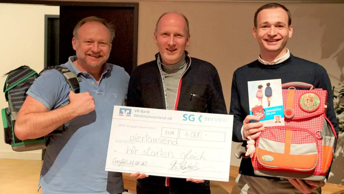 Thomas Flottemesch, Leiter Business Intelligence der SG Service IT in Osnabrück, konnte die Spende in dieser Woche an die beiden Vertreter der gemeinnützigen Gesellschaft, Fabian Voges und Reinhard Höfelmeyer, übergeben. Flottemesch freut sich, dass aufgrund der Spende seines Unternehmens insgesamt 40 neue Schultornister an junge Schulanfänger übergeben werden.