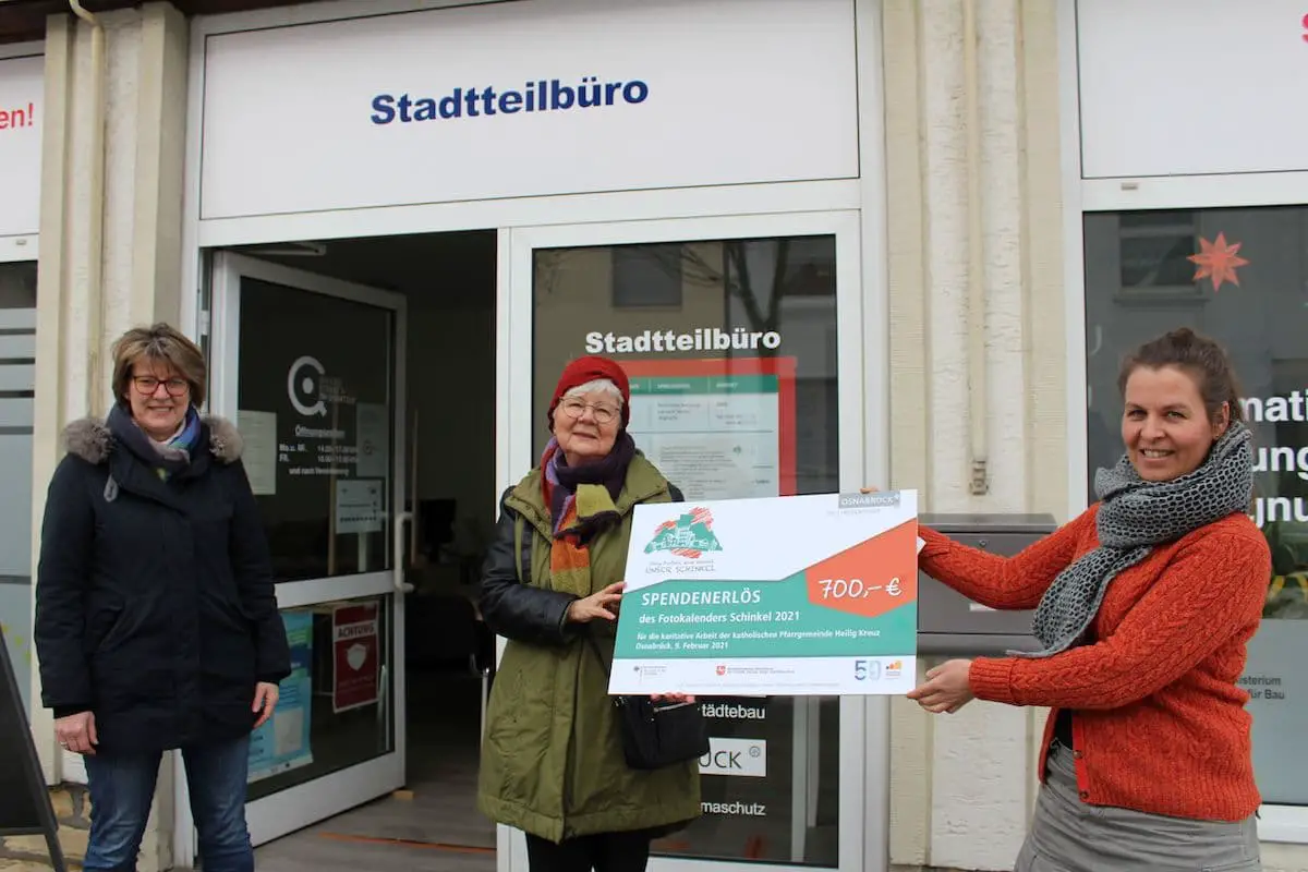 Ein Scheck über 700 Euro – der Erlös des Schinkelkalenders – geht an die caritative Arbeit der Kirchengemeinde Heilig Kreuz für Familien, Geflüchtete und Einzelpersonen. Maria Lückmann (links), Sozialpädagogin im Gemeindedienst der Heilig Kreuz Gemeinde, Christel Dahl, Ehrenamtliches Mitglied in der Vinzenz-Gruppe und Kassenwartin, Ananda Webermann, Quartiersmanagerin. / Foto: Christoph Schüle.