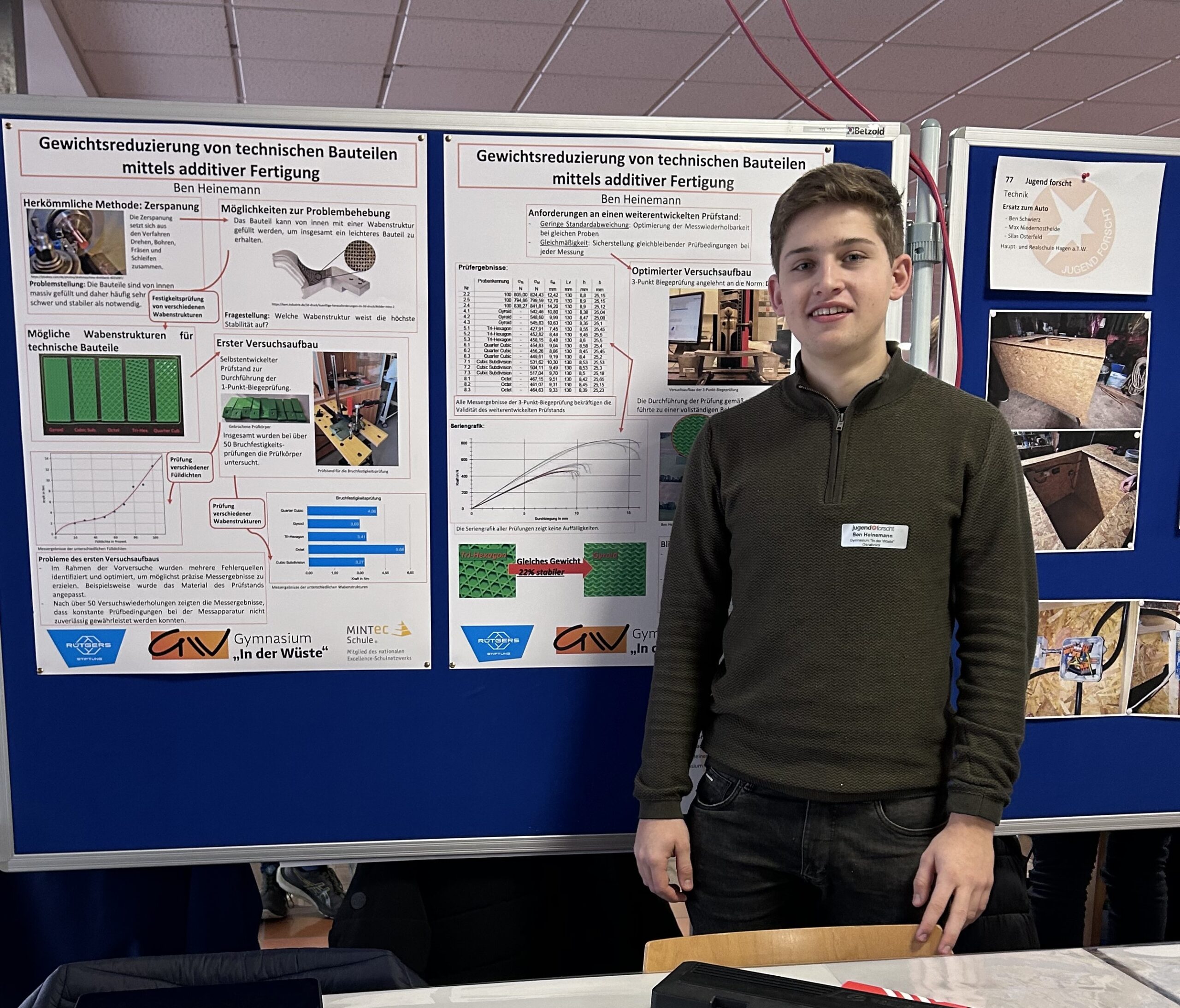 Auch Ben Heinemann (Jahrgangsstufe 13) konnte die Jury mit seinen Forschungen zur „Gewichtsreduzierung von technischen Bauteilen mittels additiver Fertigung“ überzeugen und gewann in der Kategorie „Technik“. Ebenfalls sicherte er sich den Sonderpreis „Qualitätssicherung durch zerstörungsfreie Prüfung“ und wird sein Projekt beim Landeswettbewerb Jugend forscht in Clausthal-Zellerfeld vorstellen.