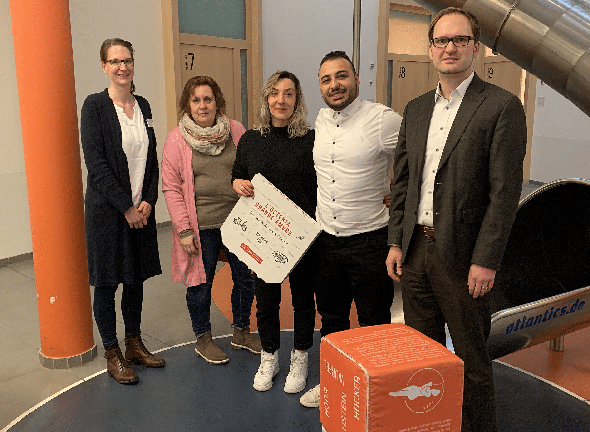 Die Pizzen wurden von Jutta Ufer-Kiefer aus Bramsche und ihren fleißigen Helfern (Kinder aus Venne und Osnabrück) an die kleinen Patienten verteilt. Die Filialleiterin der L’Osteria, Natalie Gurrieri, unterstützte die Aktion. Sie hob hervor, dass es ihr sehr am Herzen läge den kranken Kindern vor Ort eine Freude zu machen. Und dies gelang den Initiatoren der Aktion – alle Kinder waren begeistert. Frau Ufer-Kiefer überbrachte allen kranken Kindern außerdem jeweils ein Geschenkepaket mit Süßigkeiten. Finanziell unterstützt wurde die Aktion von Transporte Christian Wilmering aus Schwagstorf.