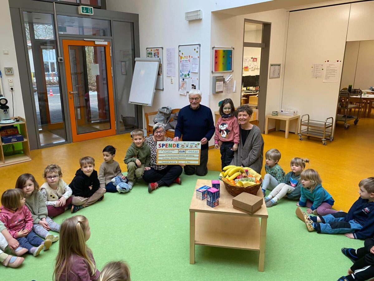 In der Kita St. Katharinen im Osnabrücker Stadtteil Wüste kamen beim Adventsbasar insgesamt 1.103,60 Euro an Spenden zusammen. Die Kinder und Angestellten hatten beim Verkauf von gebastelten, gebackenen und gekochten Dingen tatkräftig mitgeholfen. Der Erlös wird nun gezielt für die nächste Weihnachtstüten- und Weihnachtskekse-Aktion der DiakonieStiftung Osnabrück Stadt und Land eingesetzt. Doris Schmidtke und Frieder Marahrens von der Stiftung nahmen den symbolischen Scheck am vergangenen Freitag (6. Februar) in der Kita von den Kindern sowie Leiterin Silke Peters entgegen und hatten als Dankeschön einen gefüllten Obstkorb und Tee mitgebracht.