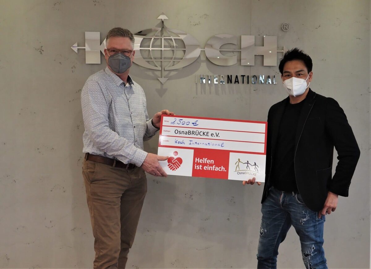 Titelbild: Heiner Koch (l., Koch International) und Jan Eisenblätter (OsnaBRÜCKE e. V.) bei der Spendenübergabe. / Foto: Kirstin Flüssmeyer