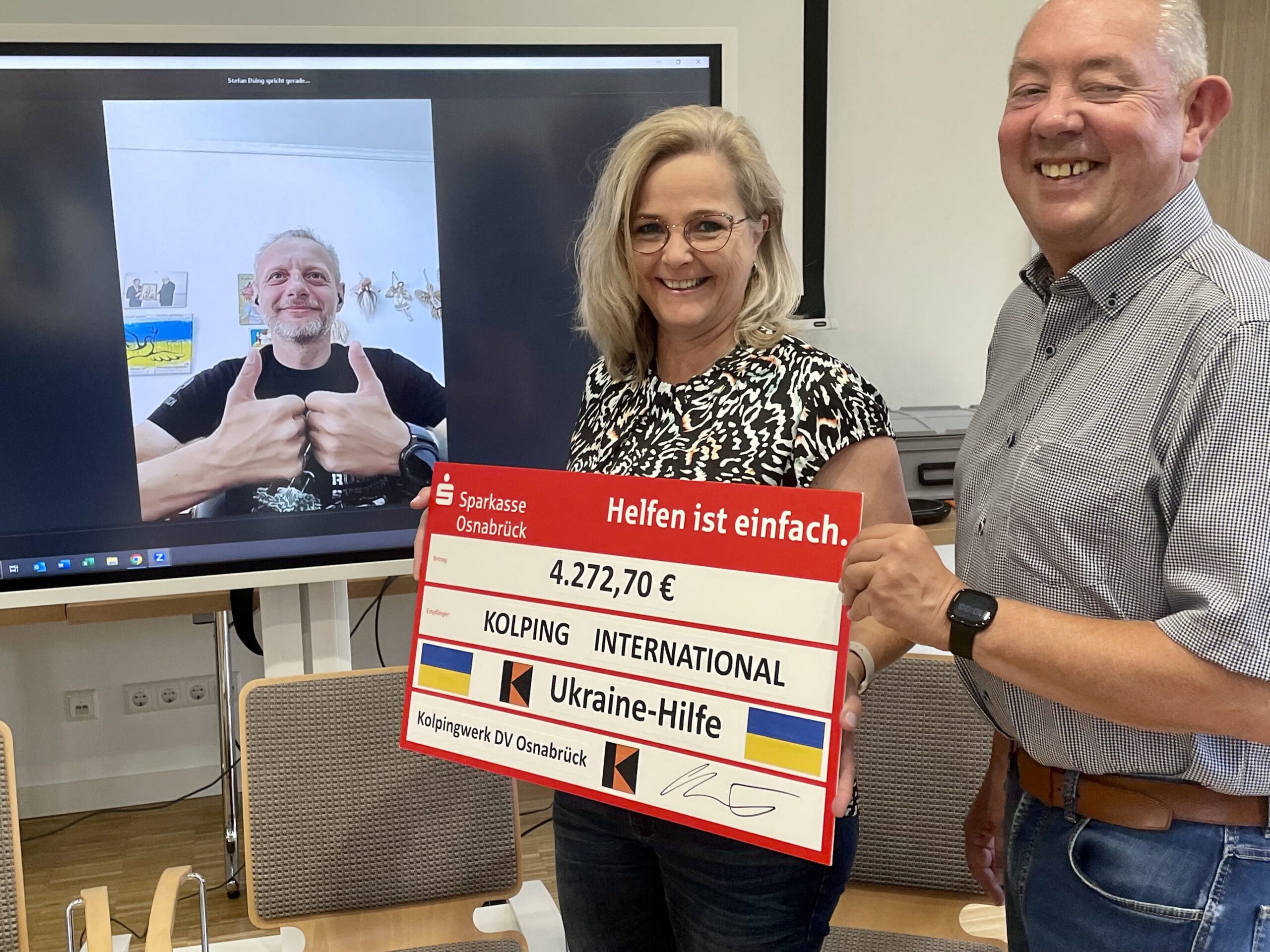 4.272,70 Euro kamen über den Spendenaufruf zusammen. Der symbolische Scheck wurde nun virtuell an den Geschäftsführer des Kolpingwerkes in der Ukraine, Vasyl Savak, durch die beiden Diözesanvorsitzenden Marion Nagel und Dieter Bünker übergeben. Das Geld wird vor Ort für die Traumtherapie von Kriegsflüchtlingen verwendet.