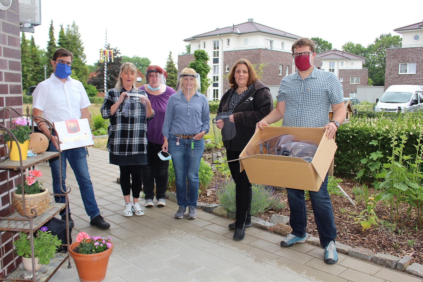 Die Pflegerin Martina Ebeling hat aus der Presse vom Engagement des Labors erfahren. Sie wandte sich an die Laboringenieurin Stefanie Wibbeler und schilderte ihr die Lage in der Pflegeeinrichtung: „Seit zweieinhalb Monaten sind wir in Kurzarbeit, viele im Team sind alleinerziehend und deshalb auch Alleinverdienerinnen. Von Gesichtsschilden erhoffen wir uns zusätzlichen Schutz und auch mehr Tragekomfort.“ Nach wenigen Wochen hielten die Mitarbeiterinnen der Tagespflege Atterhof ihre Spende in der Hand. „Wir sind dem Hochschulteam sehr dankbar für diese tolle Hilfe“, sagt Susanne Kandelhardt: „Auch für unsere Senioren ist das eine große Unterstützung: Viele hören nicht mehr gut und lesen von den Lippen. Außerdem können wir nun wieder unser ganzes Gesicht zeigen, was die nonverbale Kommunikation und das Miteinander sicher erleichtert.“