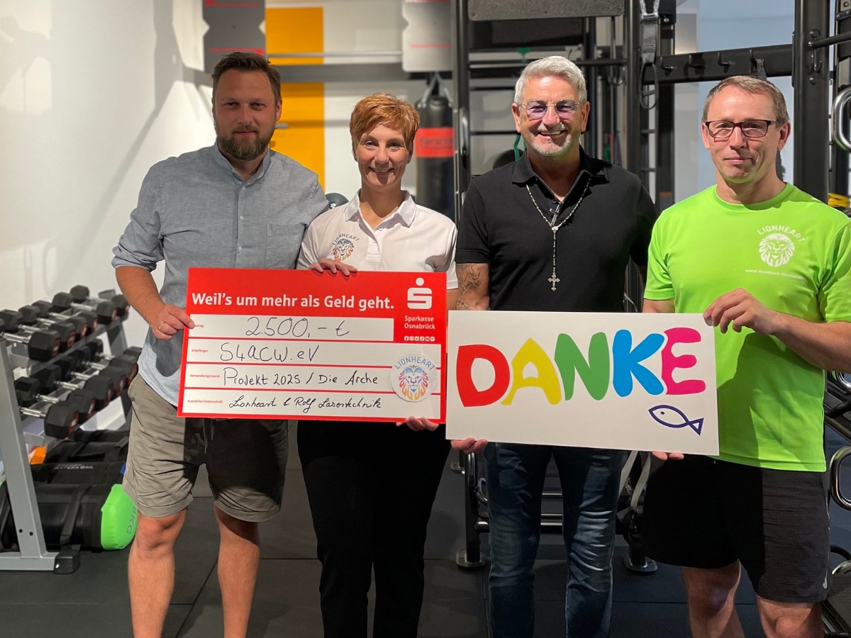 Im Frühjahr 2024 eröffnete der Fitnessclub Lionheart im Hafenquartier Osnabrück. Gemeinsam mit der Firma Rolf Lasertechnik unterstützen sie nun John McGurk und den Verein S4acw bei ihrer wichtigen Arbeit zugunsten des 30-jährigen Jubiläums der Arche im Jahr 2025. Ein Spendenscheck in Höhe von 2.500 Euro wurde jetzt übergeben.