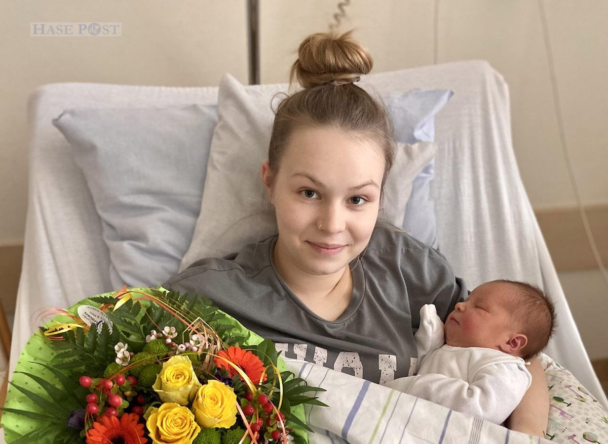 Mika-Leano Hagemann ist das Neujahrsbaby aus Melle. Seine Mutter Melina Riedel wurde vom CKM mit einem Blumenstrauß beglückwünscht. / Foto: CKM