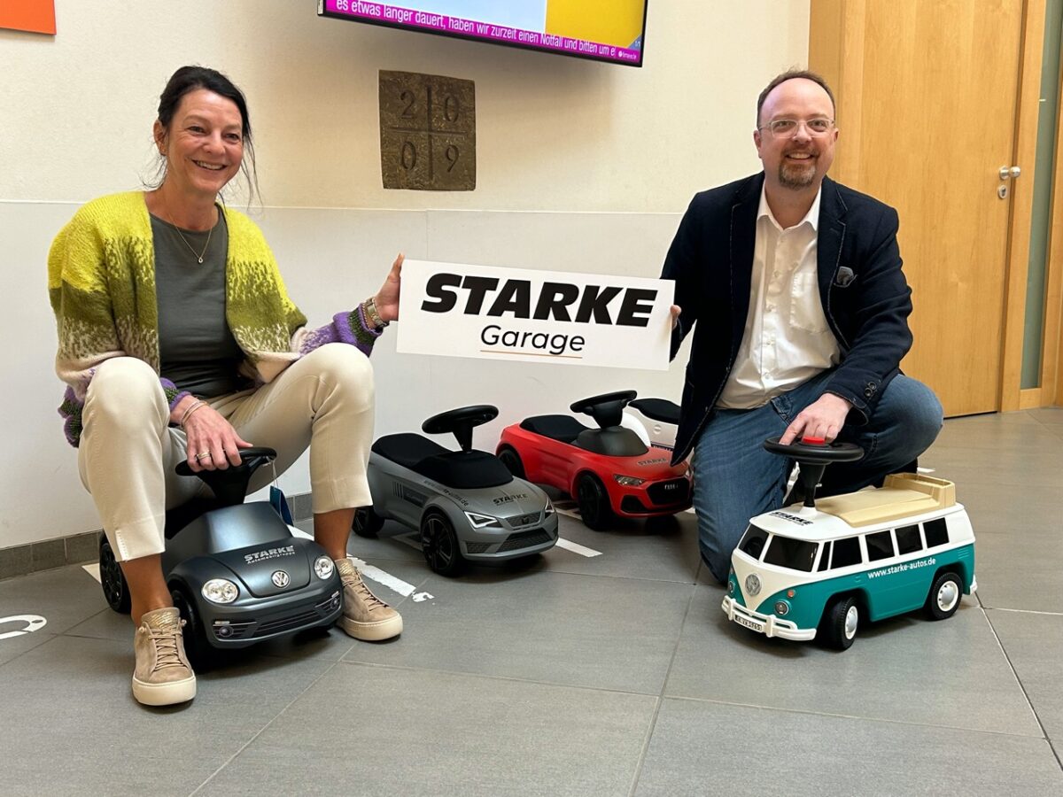 Unter anderem mit einem kultigen VW Bulli können Kinder künftig im Christlichen Kinderhospital Osnabrück (CKO) durch den Wartebereich vor der Notaufnahme düsen. Insgesamt fünf Rutschautos hat die STARKE Automobilgruppe in Osnabrück dem CKO zur Verfügung gestellt.
